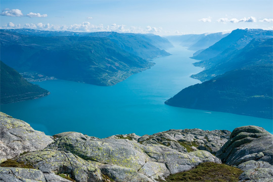В самом сердце норвежской природы, к юго-востоку от Бергена, вы будете путешествовать по спокойным водам Хардангер-фьорда, второго по длине фьорда в Норвегии. В широкой дельте этого величественного фьорда открываются виды на плодородные луга и множество фруктовых деревьев. Его часто называют «фруктовым садом Норвегии». По мере вашего продвижения внутрь страны фьорд становится уже, а холмистые окрестности сменяются высокими стенами и горными районами. Световые отражения в воде, иногда прозрачной, а иногда глубокой, делают пейзажи более дикими и похожими на необработанный алмаз исключительной красоты.