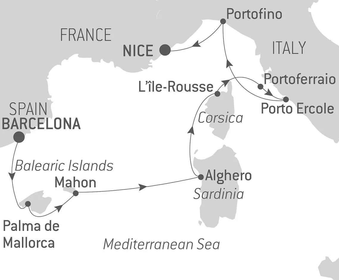 Маршрут круиза: Барселона - море - Порто Черво, о. Сардиния - Аяччо, о. Корсика - Сен-Тропе - Портофино - Ливорно / Флоренция, Пиза - Чивитавеккья / Рим - Неаполь / Помпеи - о. Капри - о. Капри - Кальви, о. Корсика - Вильфранш / Ницца - Марсель - Маон, о. Менорка - Барселона