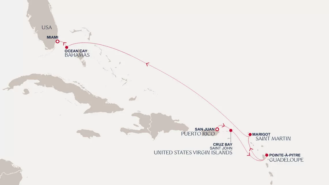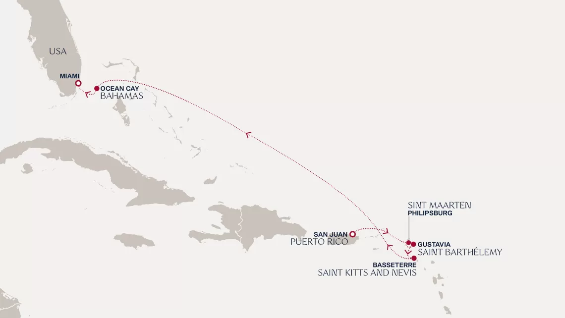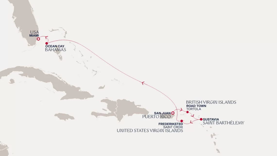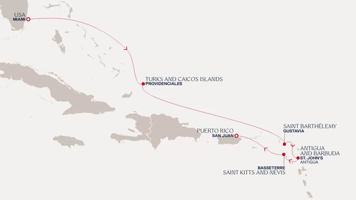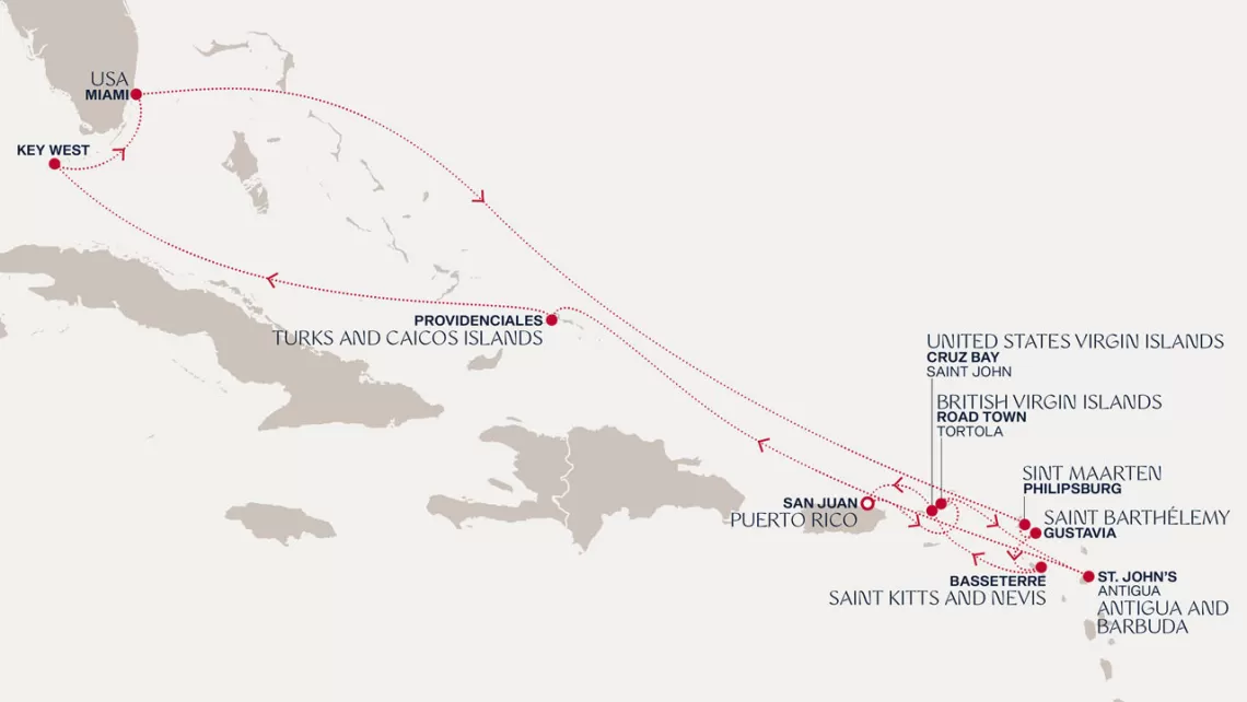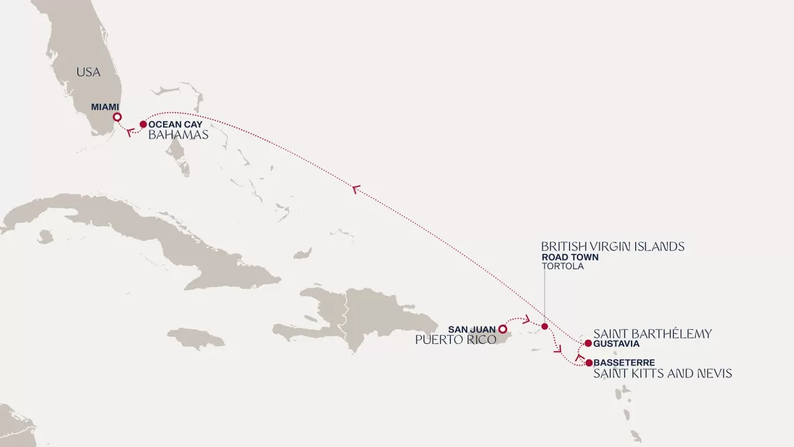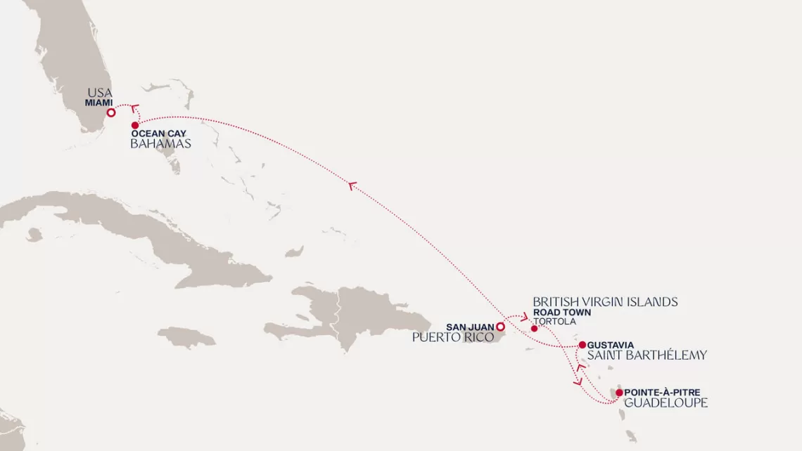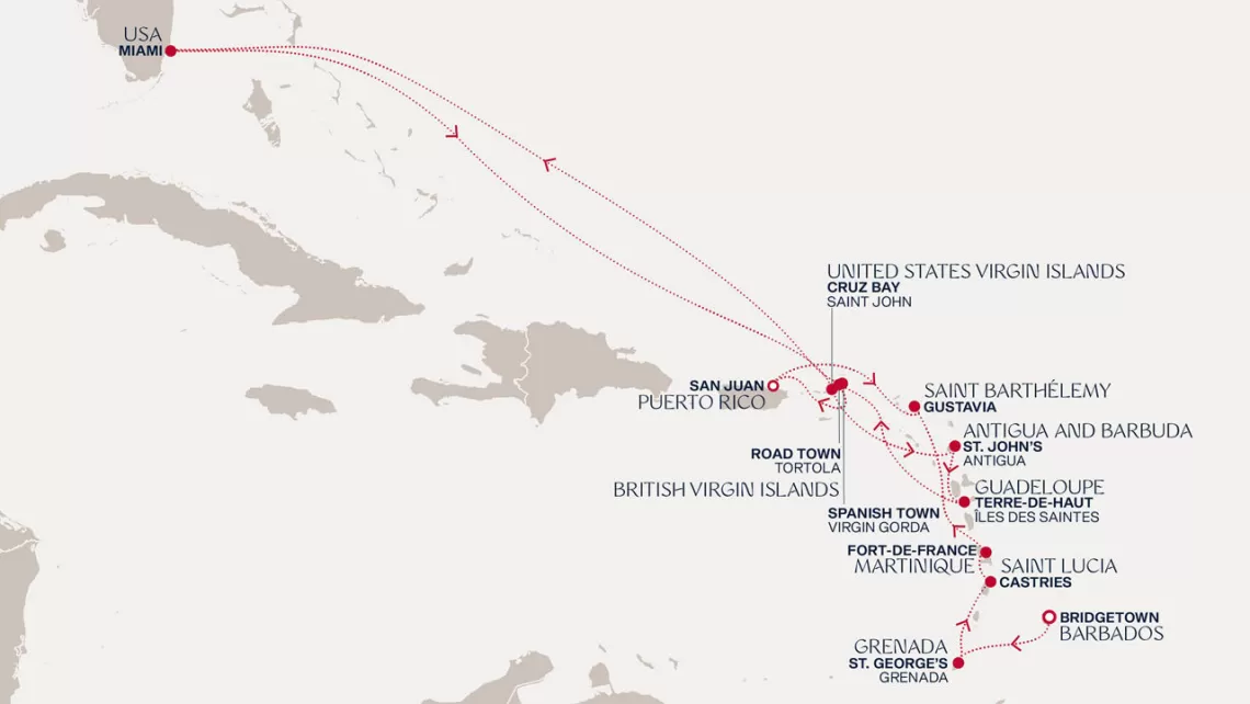 Маршрут круиза: Бриджтаун, о. Барбадос - Сент-Джорджес, о. Гренада - Кастри, о. Сент-Люсия - Фор-де-Франс, о. Мартиника - Густавия, о. Сен-Бартельми - Густавия, о. Сен-Бартельми - о. Верджин-Горда - море - море - Майами - море - море - о. Сент-Джон - Сент-Джонс, о.Антигуа - о. Тер-де-О, Гваделупа - Род-Таун, о. Тортола - Сан-Хуан