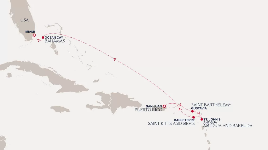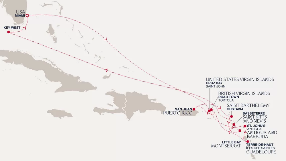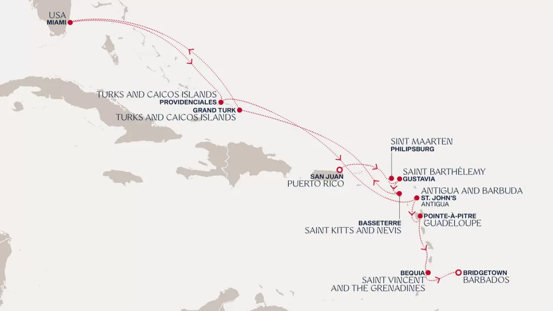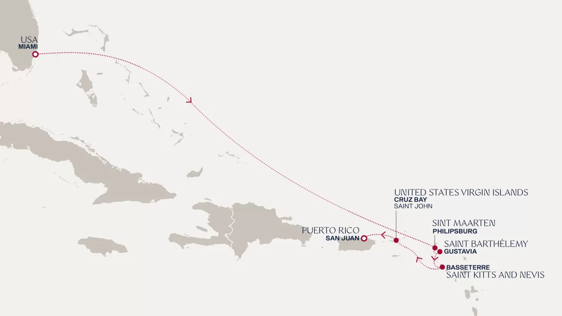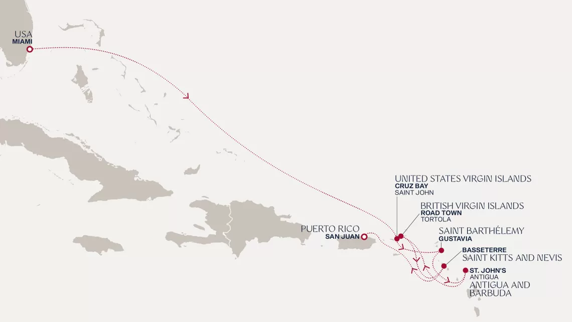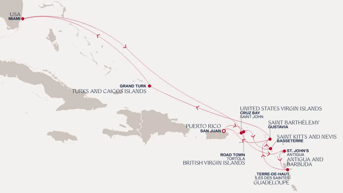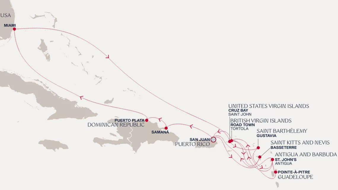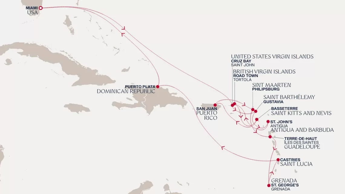 Маршрут круиза: Бриджтаун, о. Барбадос - Сент-Джорджес, о. Гренада - Кастри, о. Сент-Люсия - Фор-де-Франс, о. Мартиника - Густавия, о. Сен-Бартельми - Густавия, о. Сен-Бартельми - о. Верджин-Горда - море - море - Майами - море - море - о. Сент-Джон - Сент-Джонс, о.Антигуа - о. Тер-де-О, Гваделупа - Род-Таун, о. Тортола - Сан-Хуан