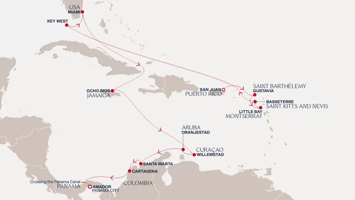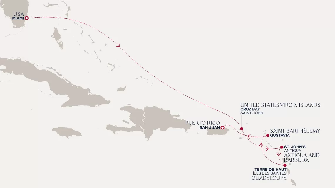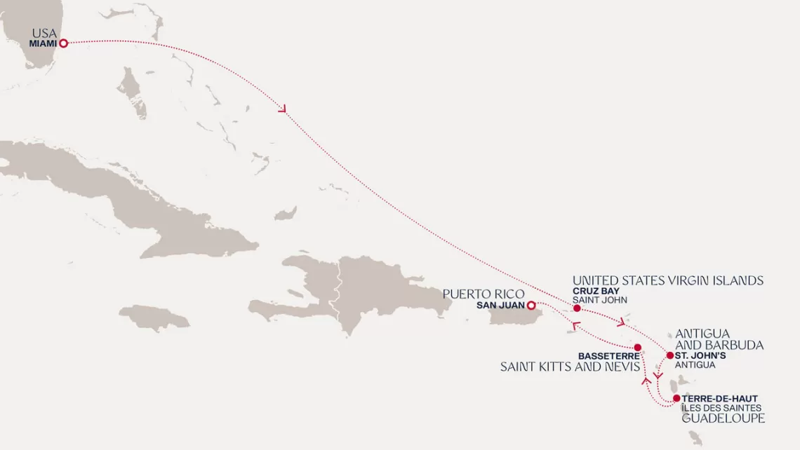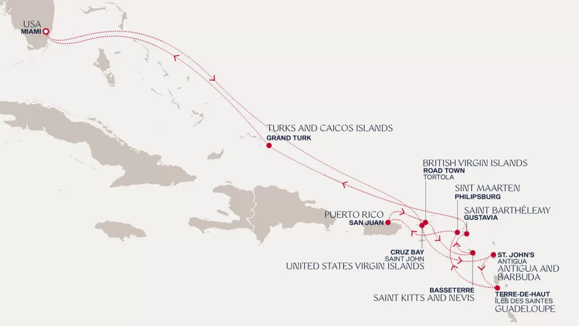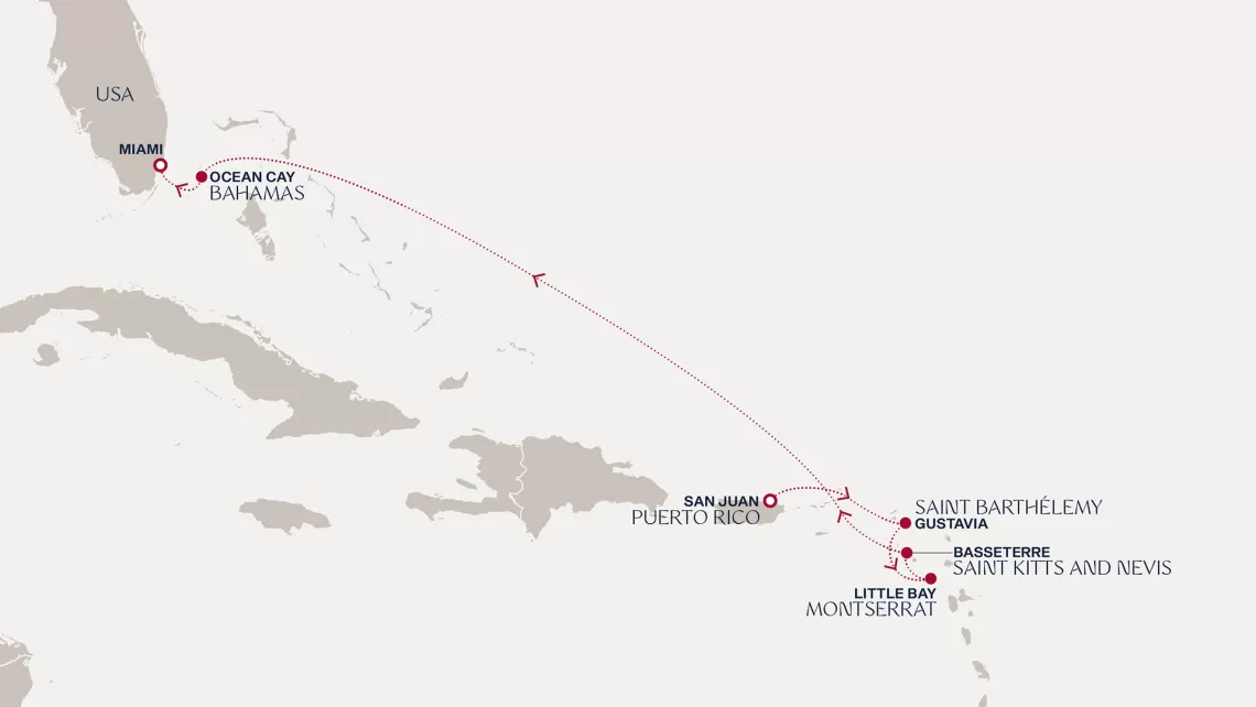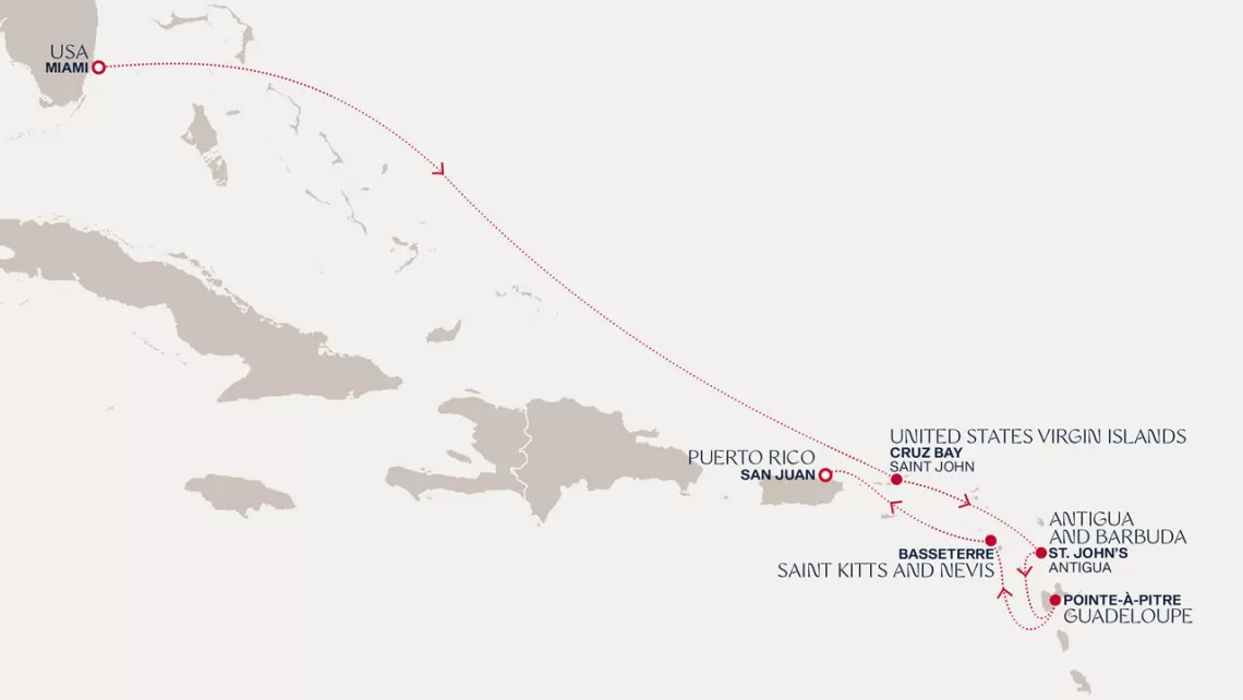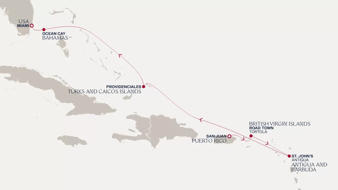 Маршрут круиза: Бриджтаун, о. Барбадос - Сент-Джорджес, о. Гренада - Кастри, о. Сент-Люсия - Фор-де-Франс, о. Мартиника - Густавия, о. Сен-Бартельми - Густавия, о. Сен-Бартельми - о. Верджин-Горда - море - море - Майами - море - море - о. Сент-Джон - Сент-Джонс, о.Антигуа - о. Тер-де-О, Гваделупа - Род-Таун, о. Тортола - Сан-Хуан