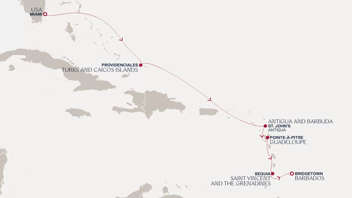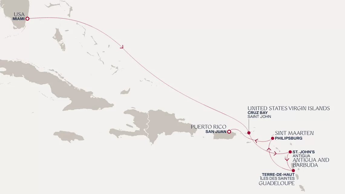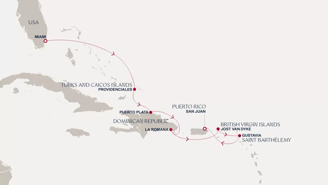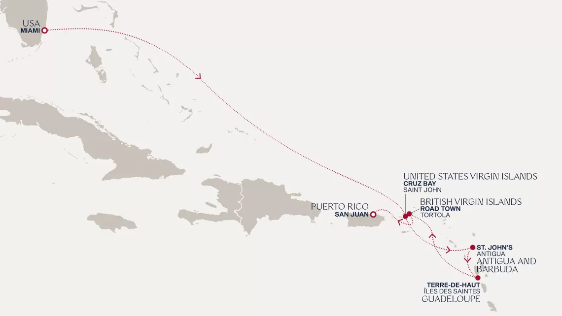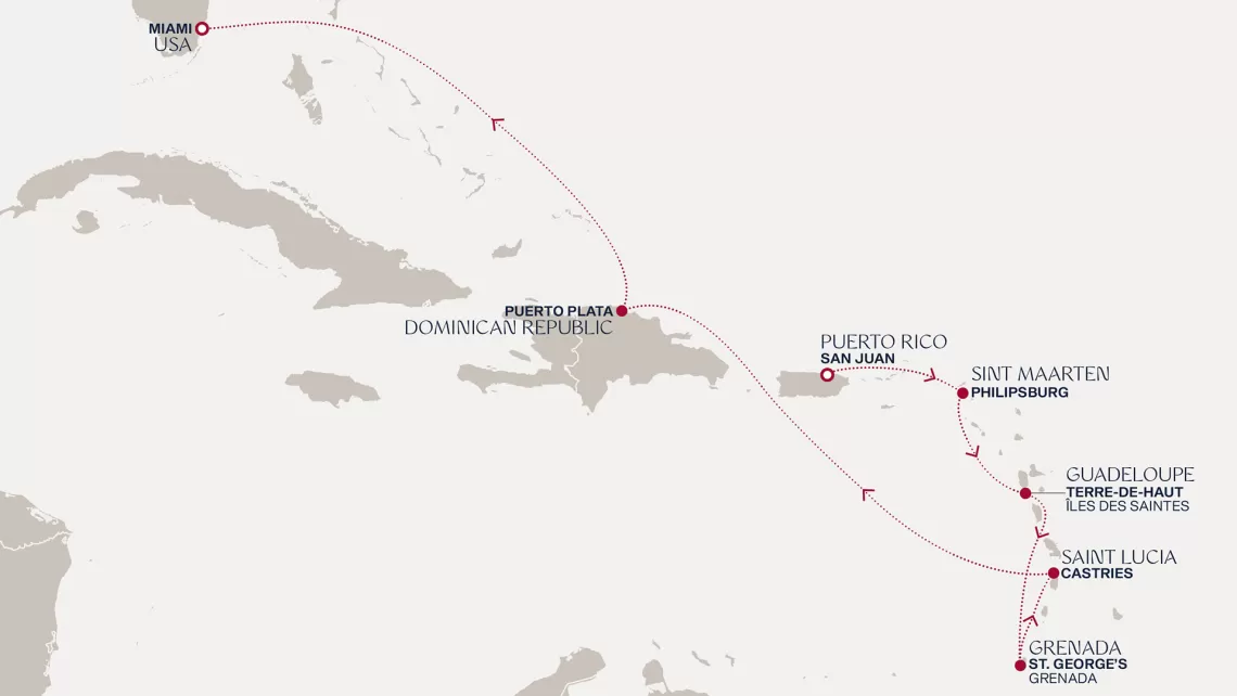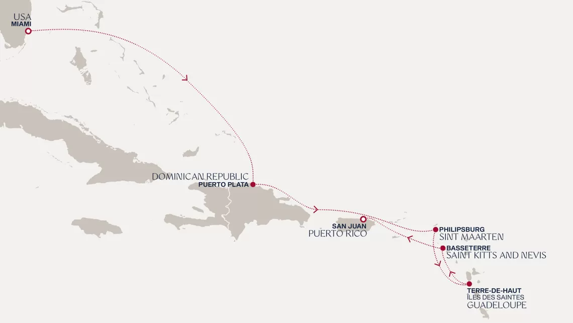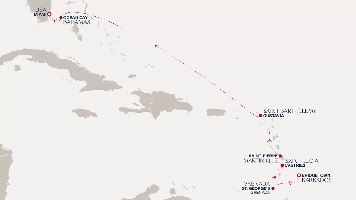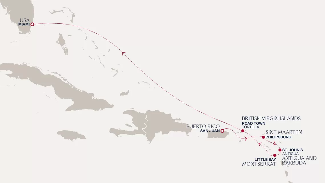 Маршрут круиза: Бриджтаун, о. Барбадос - Сент-Джорджес, о. Гренада - Кастри, о. Сент-Люсия - Фор-де-Франс, о. Мартиника - Густавия, о. Сен-Бартельми - Густавия, о. Сен-Бартельми - о. Верджин-Горда - море - море - Майами - море - море - о. Сент-Джон - Сент-Джонс, о.Антигуа - о. Тер-де-О, Гваделупа - Род-Таун, о. Тортола - Сан-Хуан
