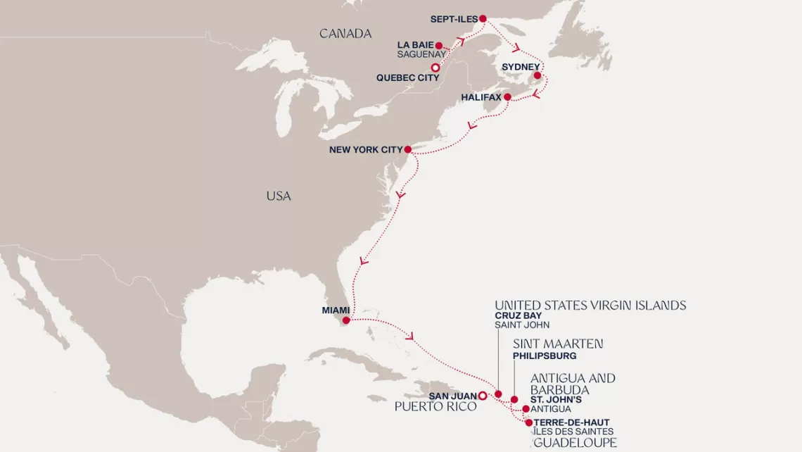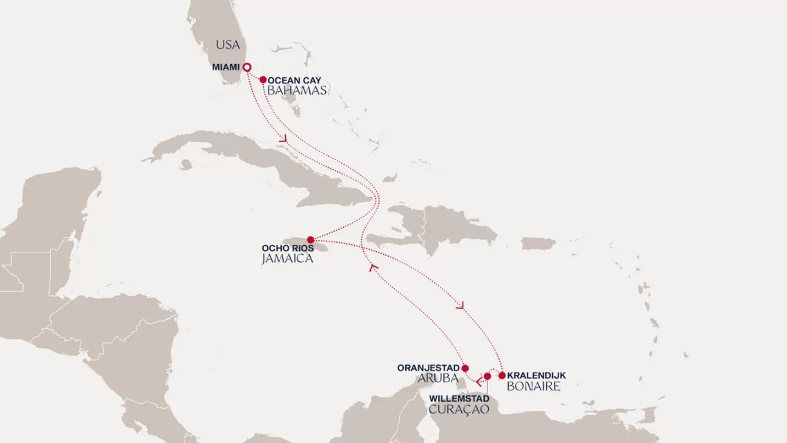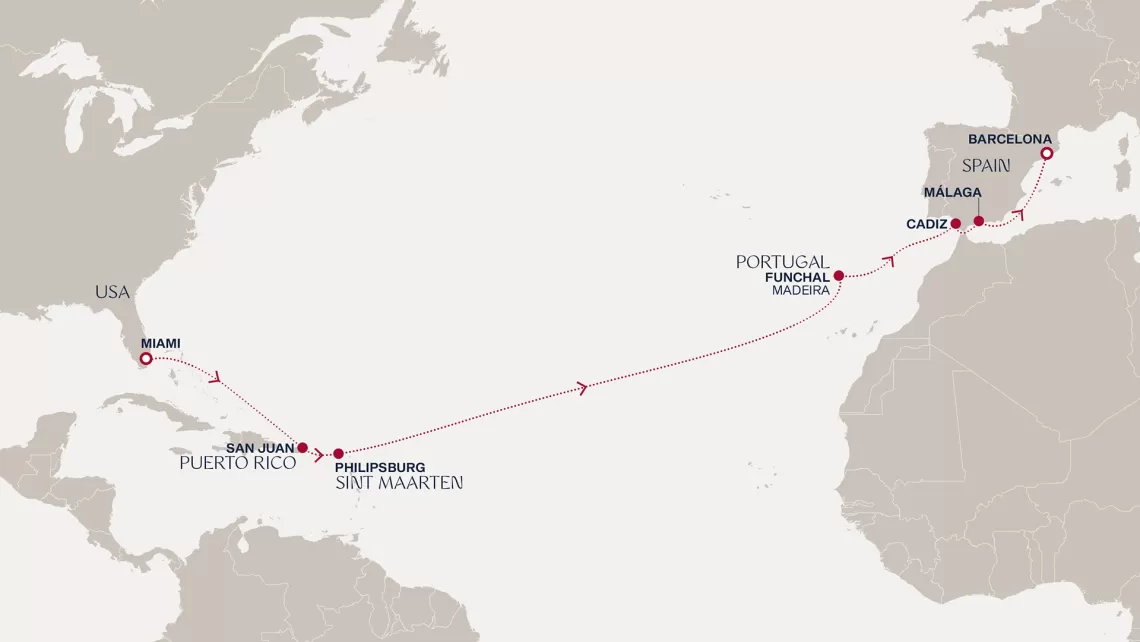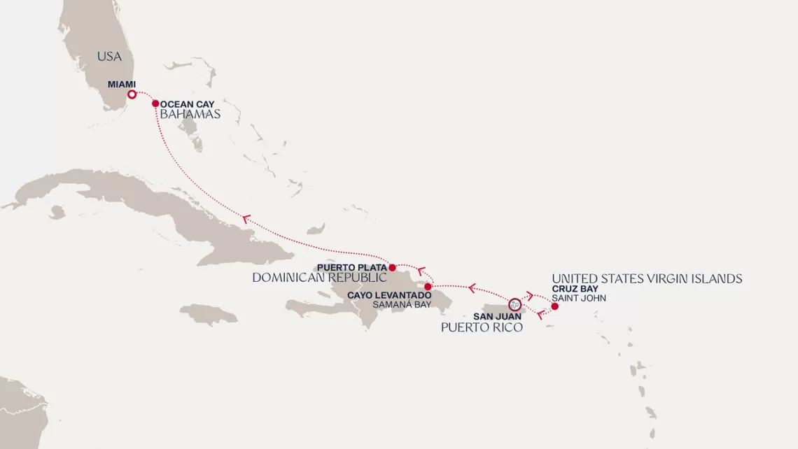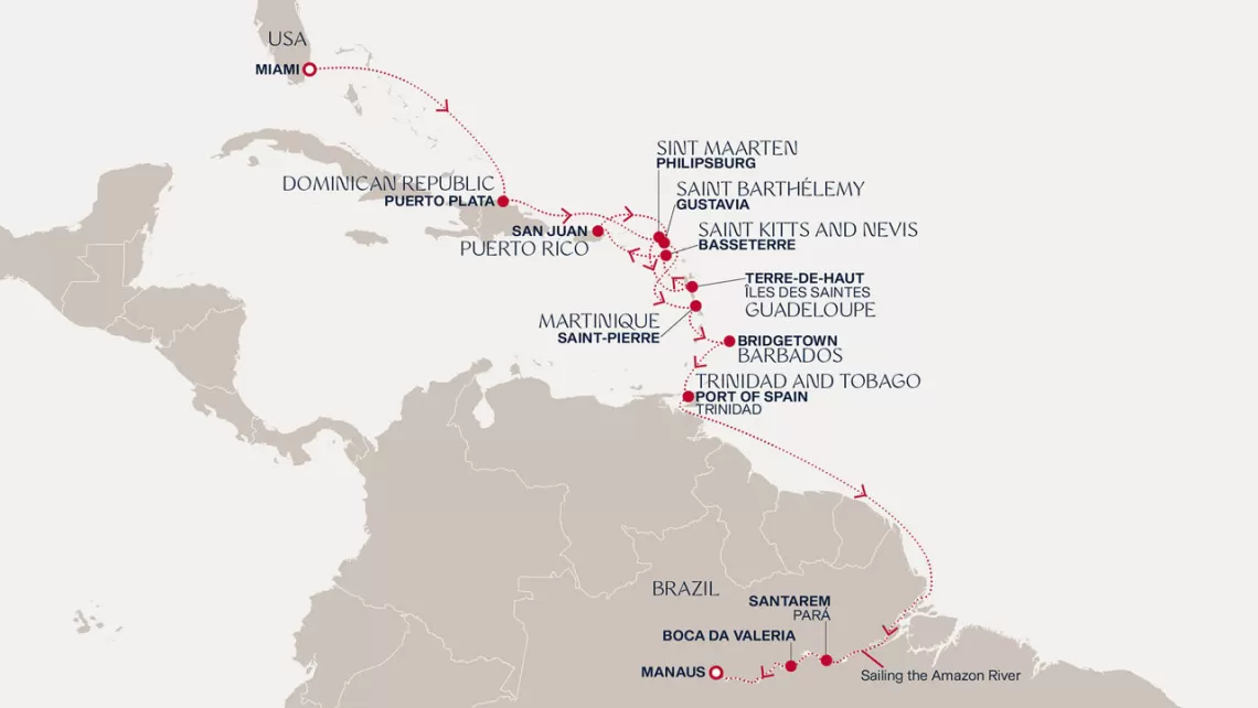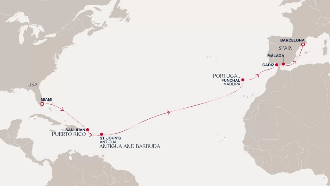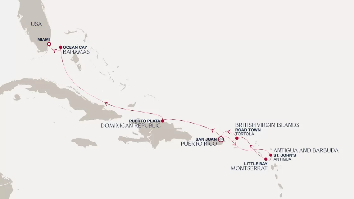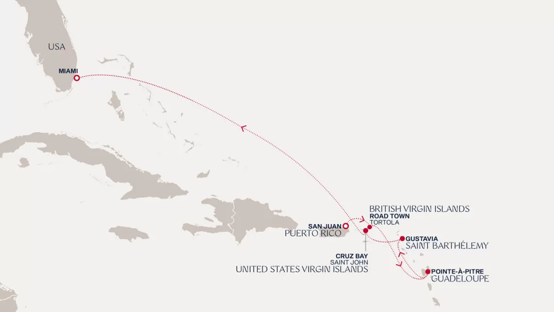 Маршрут круиза: Бриджтаун, о. Барбадос - Сент-Джорджес, о. Гренада - Кастри, о. Сент-Люсия - Фор-де-Франс, о. Мартиника - Густавия, о. Сен-Бартельми - Густавия, о. Сен-Бартельми - о. Верджин-Горда - море - море - Майами - море - море - о. Сент-Джон - Сент-Джонс, о.Антигуа - о. Тер-де-О, Гваделупа - Род-Таун, о. Тортола - Сан-Хуан