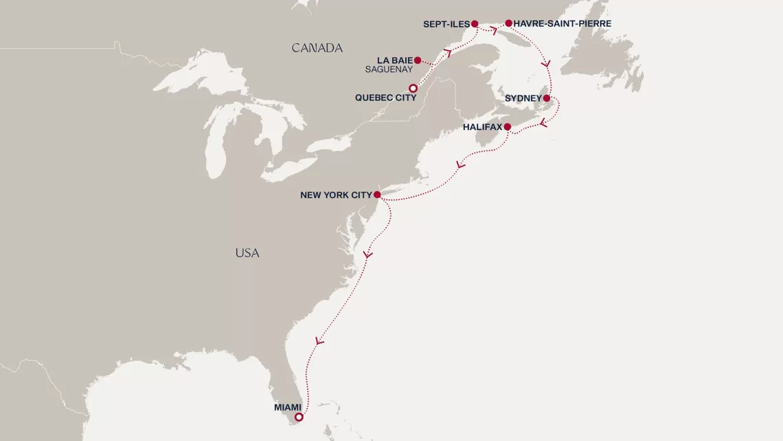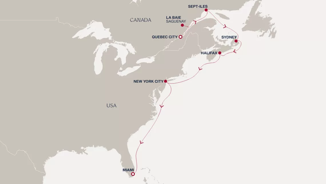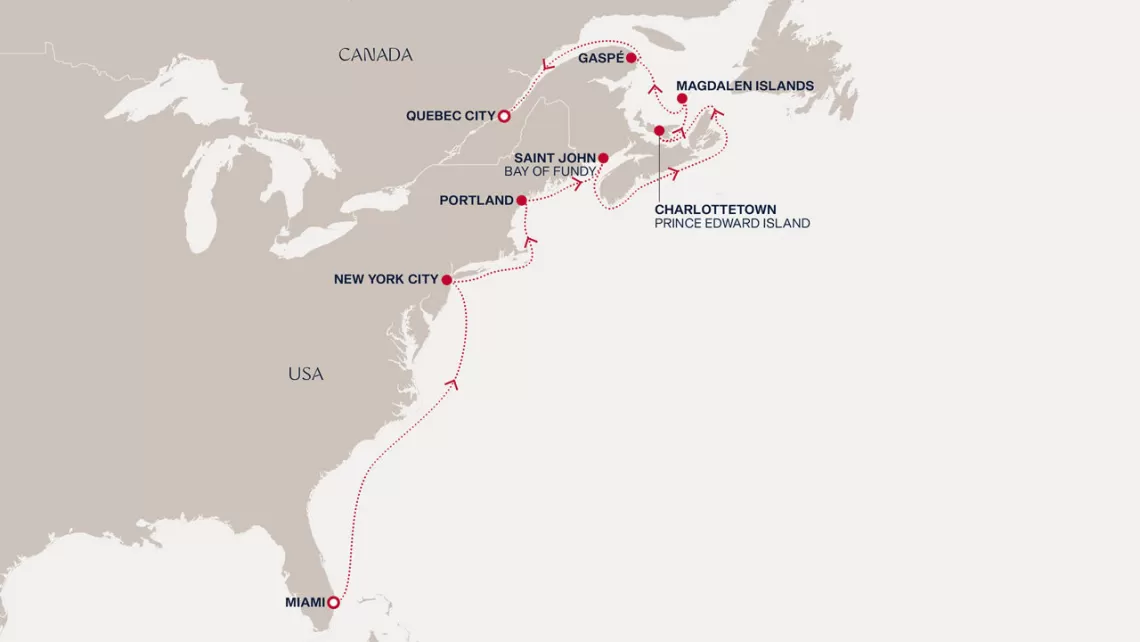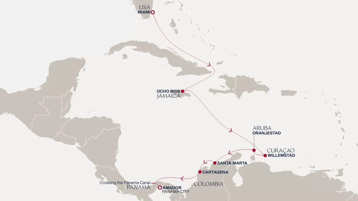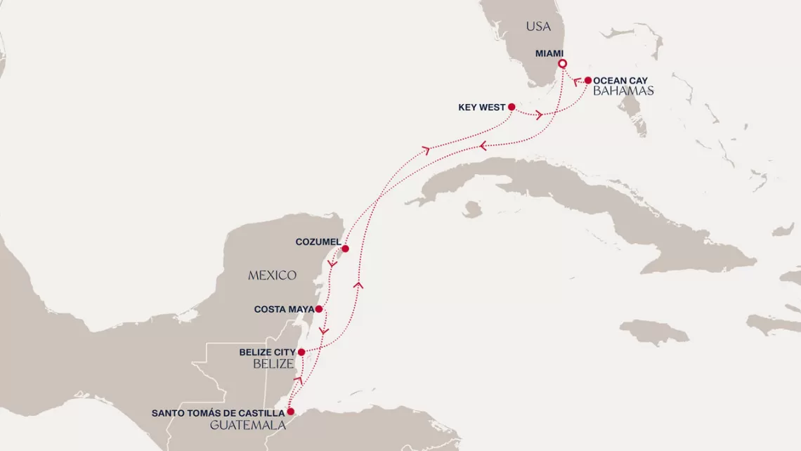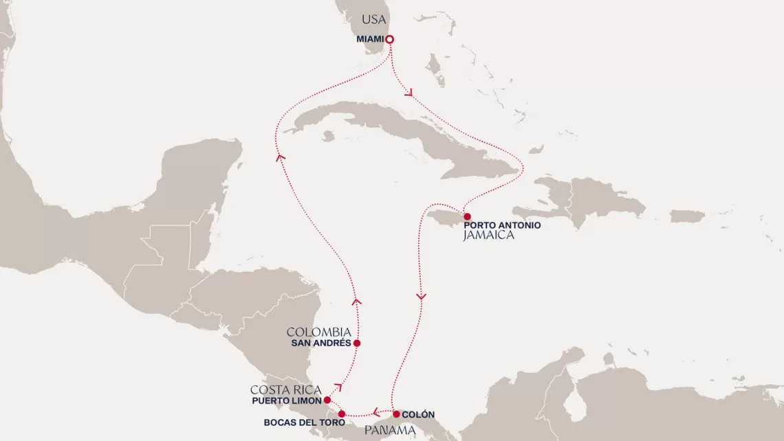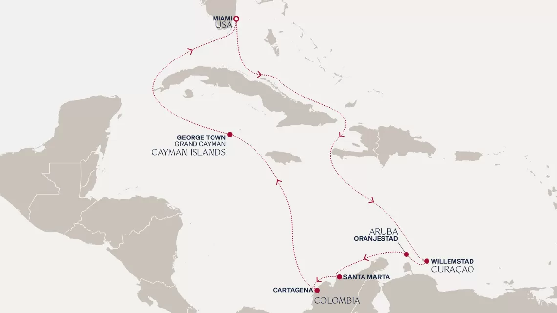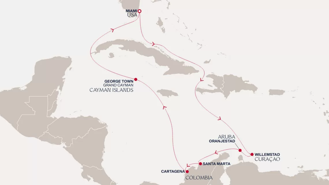 Маршрут круиза: Бриджтаун, о. Барбадос - Сент-Джорджес, о. Гренада - Кастри, о. Сент-Люсия - Фор-де-Франс, о. Мартиника - Густавия, о. Сен-Бартельми - Густавия, о. Сен-Бартельми - о. Верджин-Горда - море - море - Майами - море - море - о. Сент-Джон - Сент-Джонс, о.Антигуа - о. Тер-де-О, Гваделупа - Род-Таун, о. Тортола - Сан-Хуан