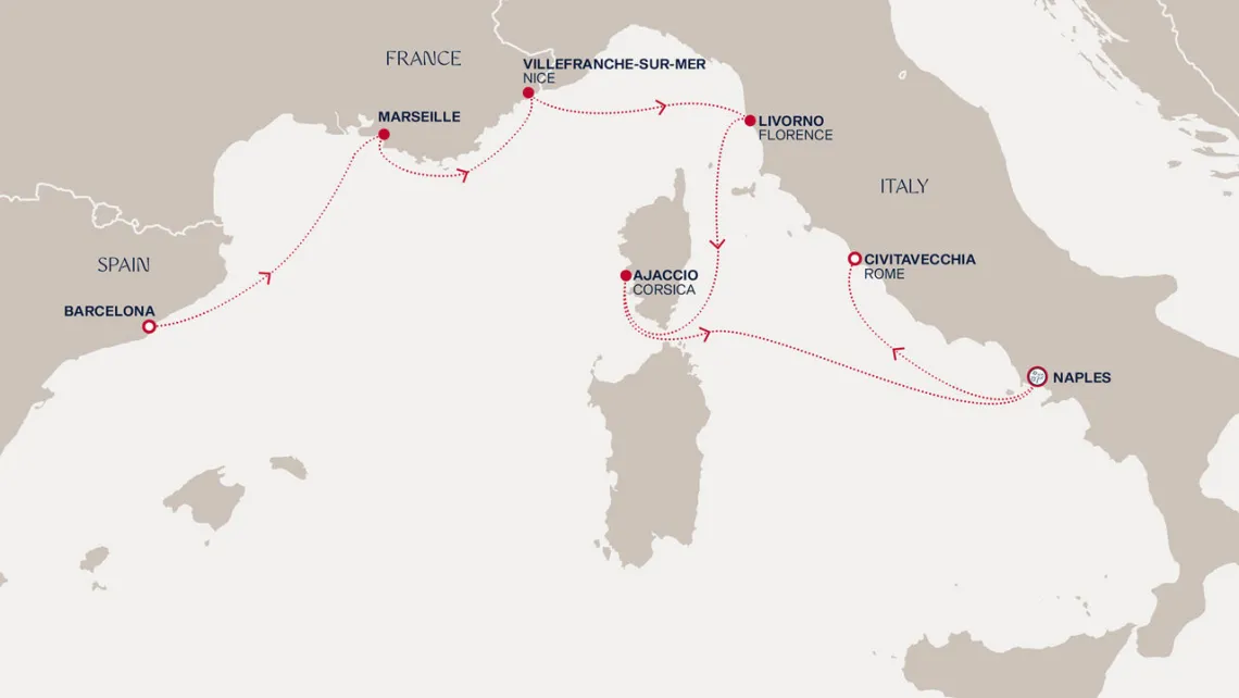 Маршрут круиза: Барселона - море - Порто Черво, о. Сардиния - Аяччо, о. Корсика - Сен-Тропе - Портофино - Ливорно / Флоренция, Пиза - Чивитавеккья / Рим - Неаполь / Помпеи - о. Капри - о. Капри - Кальви, о. Корсика - Вильфранш / Ницца - Марсель - Маон, о. Менорка - Барселона