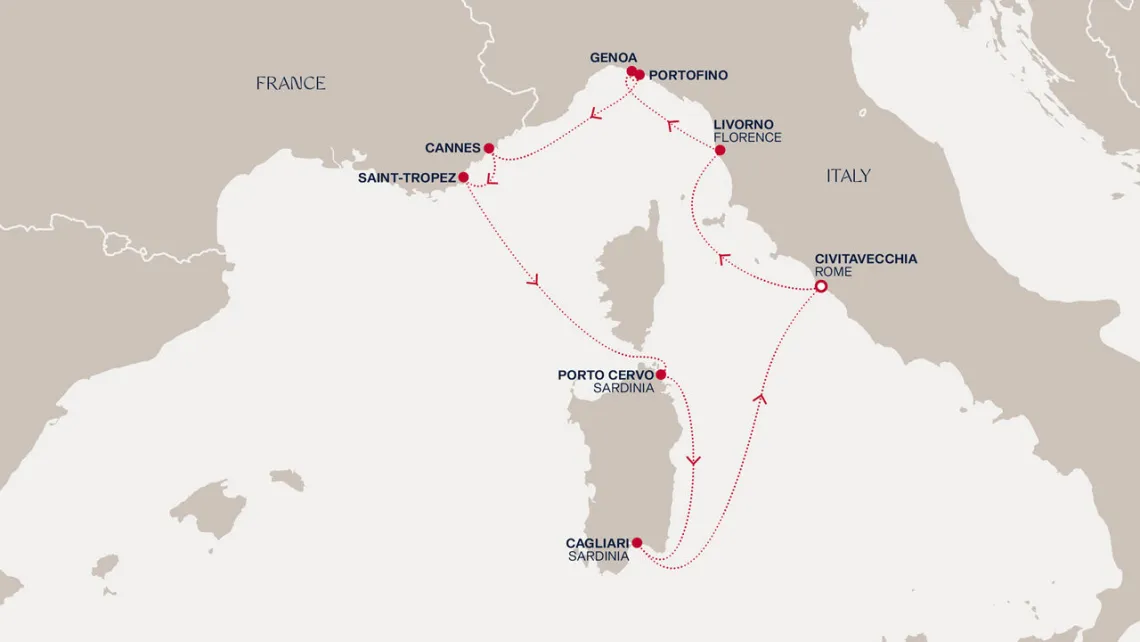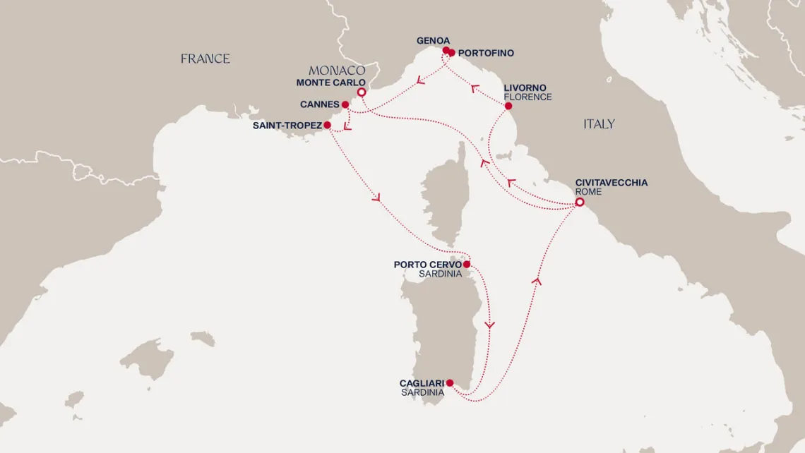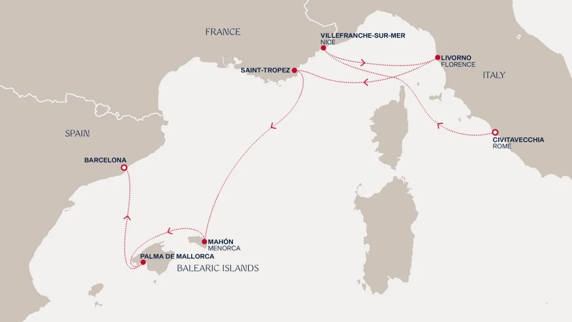 Маршрут круиза: Чивитавеккья / Рим - Порто Санто Стефано - Монте-Карло - Сен-Тропе - море - Валенсия - Маон, о. Менорка - Барселона - море - Канны - Портофино - Ливорно / Флоренция, Пиза - Порто Черво, о. Сардиния - Аяччо, о. Корсика - Чивитавеккья / Рим