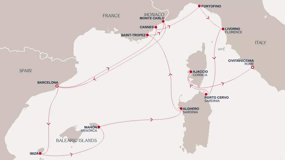 Маршрут круиза: Барселона - о. Ибица - Маон, о. Менорка - Альгеро, о. Сардиния - Сен-Тропе - Монте-Карло - море - Барселона - море - Канны - Портофино - Ливорно / Флоренция, Пиза - Порто Черво, о. Сардиния - Аяччо, о. Корсика - Чивитавеккья / Рим