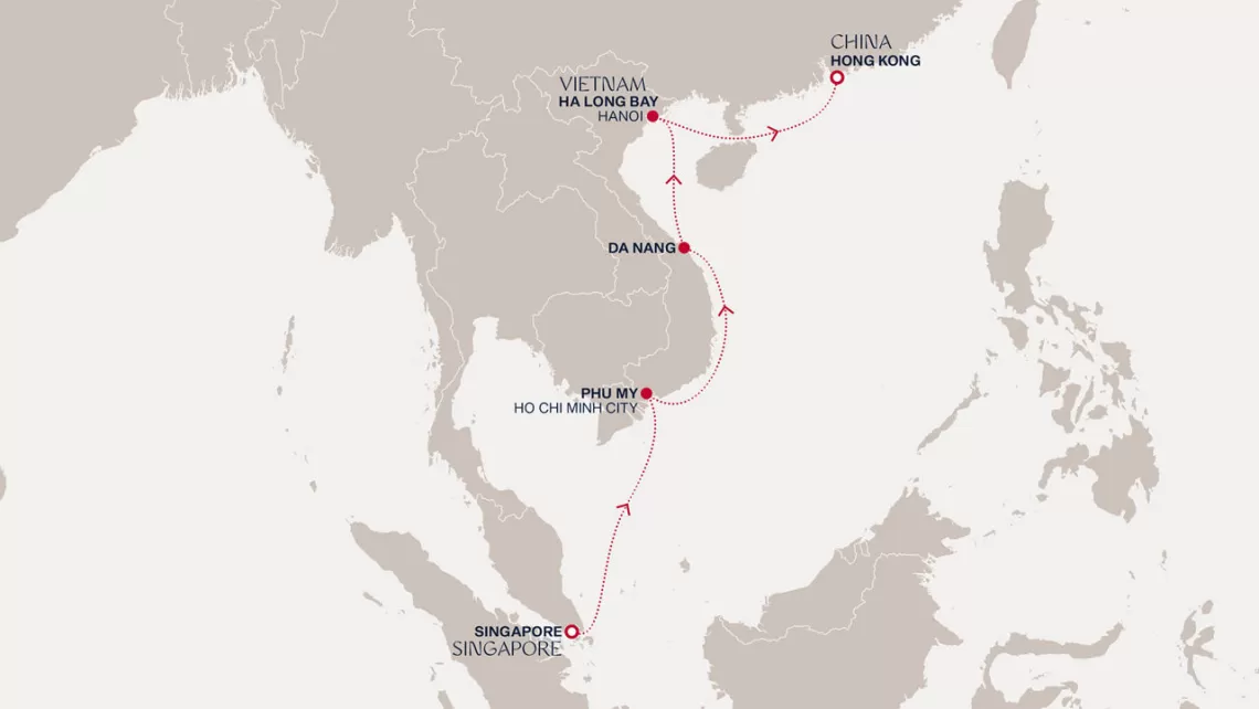 Маршрут круиза: Марсель - Барселона - море - море - Санта-Крус-де-Тенерифе, о. Тенерифе - море - море - море - море - море - море - о. Гранд-Терк - море - о. Оушен Кей - море - Косумель - море - Лимон - Панамский канал - Панамский канал - море - Манта - море - Кальяо / Лима - Кальяо / Лима - море - Арика - море - море - море - море - море - Ханга-Роа, о. Пасхи - море - море - Баунти-Бэй - море - море - Папеэте, о.Таити - Папеэте, о.Таити - море - море - море - море - Нукуалофа, о. Тонгатапу - море - море - Нумеа - море - море - Окленд - Тауранга - Нейпир - Пиктон - Веллингтон - море - море - море - Сидней - Сидней - море - море - море - море - Кэрнс - Кэрнс - Кэрнс - Кэрнс - Кэрнс - Кэрнс - море - море - море - море - о. Ломбок - Беноа, о. Бали - море - море - море - Хошимин - море - море - Халонг Бэй / Ханой - Халонг Бэй / Ханой - Чан Мэй - море - море - Лаем Чабанг / Бангкок - море - Сиануквиль - море - море - Сингапур - Порт-Кланг - море - море - море - Коломбо - Кочин - море - Мумбаи (быв. Бомбей) - Мумбаи (быв. Бомбей) - море - море - море - Дубай - Дубай - Маскат - море - море - море - море - море - Акаба - Суэцкий Канал - Суэцкий Канал - Александрия - море - море - Чивитавеккья / Рим - Генуя / Милан - Марсель