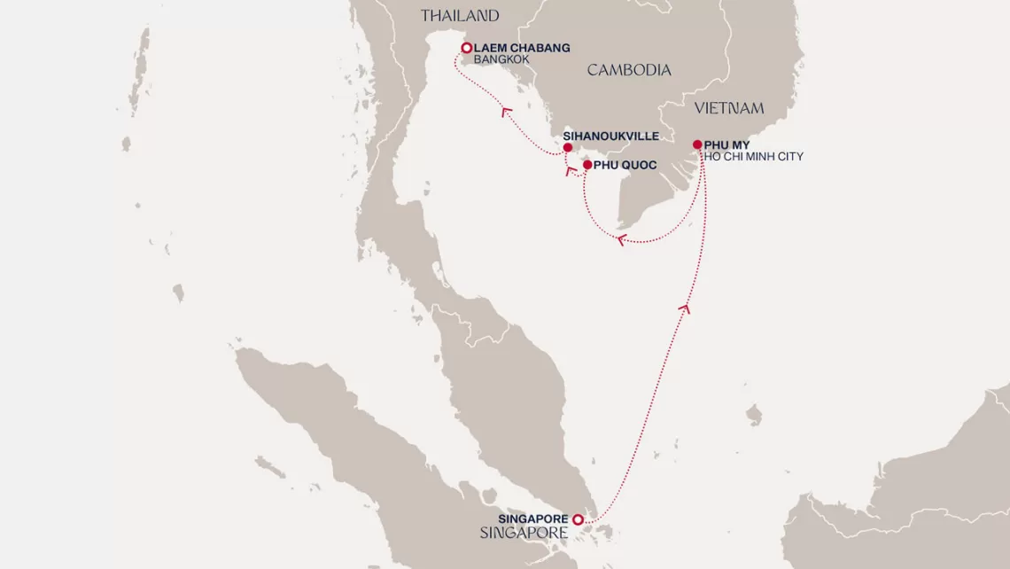 Маршрут круиза: Сингапур - море - Пхи Ми - Пхи Ми - о. Фукуок - Сиануквиль - Лаем Чабанг / Бангкок - Лаем Чабанг / Бангкок