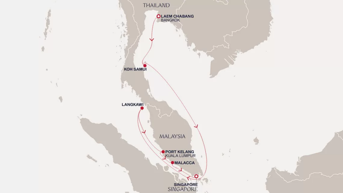Маршрут круиза: Лаем Чабанг / Бангкок - Ко Самуи - море - море - о. Лангкави - Порт-Кланг - Малакка - Сингапур