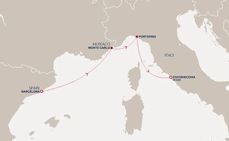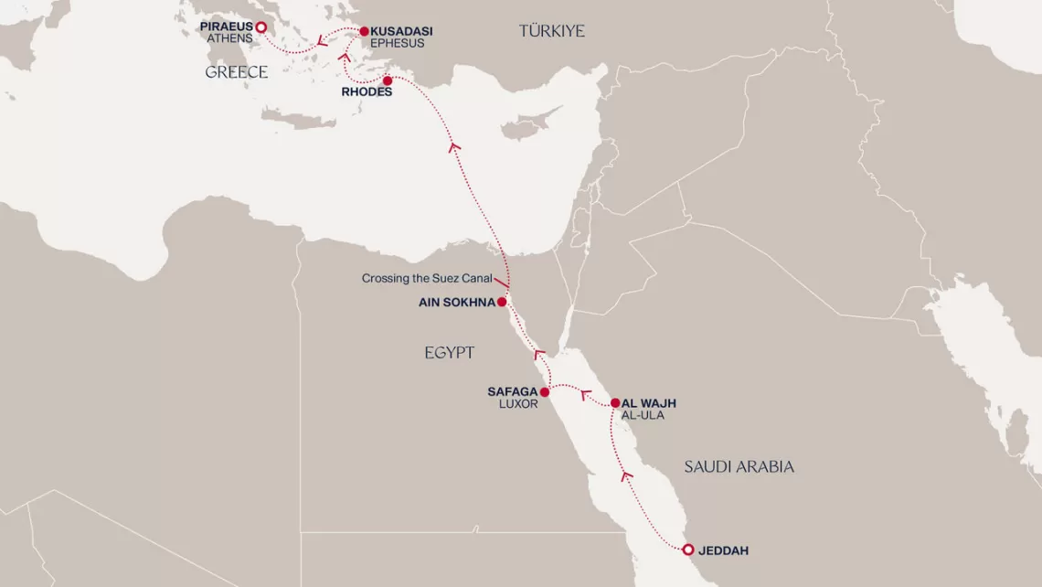Маршрут круиза: Чивитавеккья / Рим - Генуя / Милан - Марсель - Барселона - море - море - Санта-Крус-де-Тенерифе, о. Тенерифе - море - море - море - море - море - море - о. Гранд-Терк - море - о. Оушен Кей - море - Косумель - море - Лимон - Панамский канал - Панамский канал - море - Манта - море - Кальяо / Лима - Кальяо / Лима - море - Арика - море - море - море - море - море - Ханга-Роа, о. Пасхи - море - море - Баунти-Бэй - море - море - Папеэте, о.Таити - Папеэте, о.Таити - море - море - море - море - Нукуалофа, о. Тонгатапу - море - море - Нумеа - море - море - Окленд - Тауранга - Нейпир - Пиктон - Веллингтон - море - море - море - Сидней - Сидней - море - море - море - море - Кэрнс - Кэрнс - Кэрнс - Кэрнс - Кэрнс - Кэрнс - море - море - море - море - о. Ломбок - Беноа, о. Бали - море - море - море - Хошимин - море - море - Халонг Бэй / Ханой - Халонг Бэй / Ханой - Чан Мэй - море - море - Лаем Чабанг / Бангкок - море - Сиануквиль - море - море - Сингапур - Порт-Кланг - море - море - море - Коломбо - Кочин - море - Мумбаи (быв. Бомбей) - Мумбаи (быв. Бомбей) - море - море - море - Дубай - Дубай - Маскат - море - море - море - море - море - Акаба - Суэцкий Канал - Суэцкий Канал - Александрия - море - море - Чивитавеккья / Рим