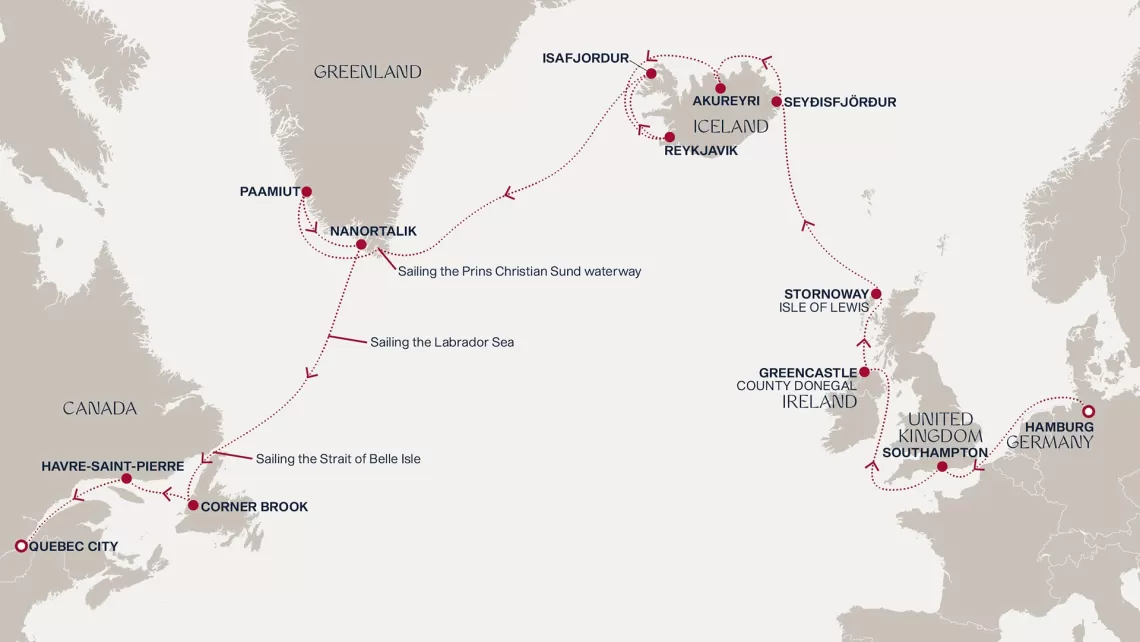Маршрут круиза: Гамбург - море - Саутгемптон / Лондон - море - Гринкасл - Сторновей - море - Сейдисфьордюр - Акюрейри - Рейкьявик - Рейкьявик - Исафьордюр - море - пролив Принца Кристиана - Паамиут - Нанорталик - море - море - Корнер-Брук - Авр-Сен-Пьер - Квебек - Квебек