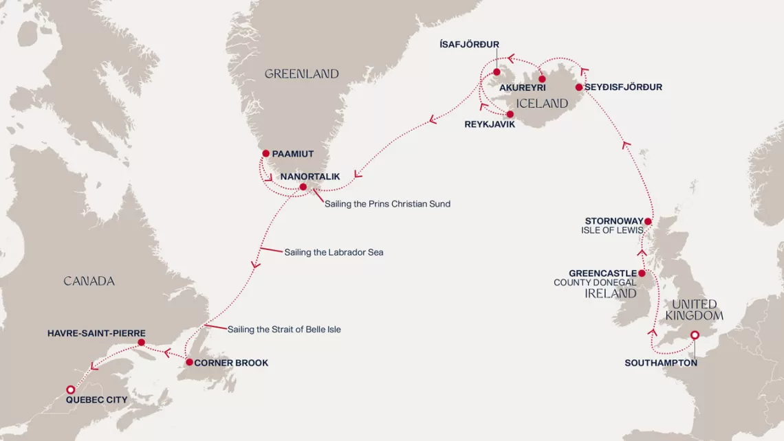 Маршрут круиза: Саутгемптон / Лондон - море - Гринкасл - Сторновей - море - Сейдисфьордюр - Акюрейри - Рейкьявик - Рейкьявик - Исафьордюр - море - пролив Принца Кристиана - Паамиут - Нанорталик - море - море - Корнер-Брук - Авр-Сен-Пьер - Квебек - Квебек
