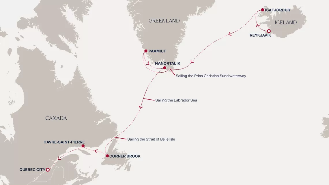 Маршрут круиза: Рейкьявик - Исафьордюр - море - пролив Принца Кристиана - Паамиут - Нанорталик - море - море - Корнер-Брук - Авр-Сен-Пьер - Квебек - Квебек