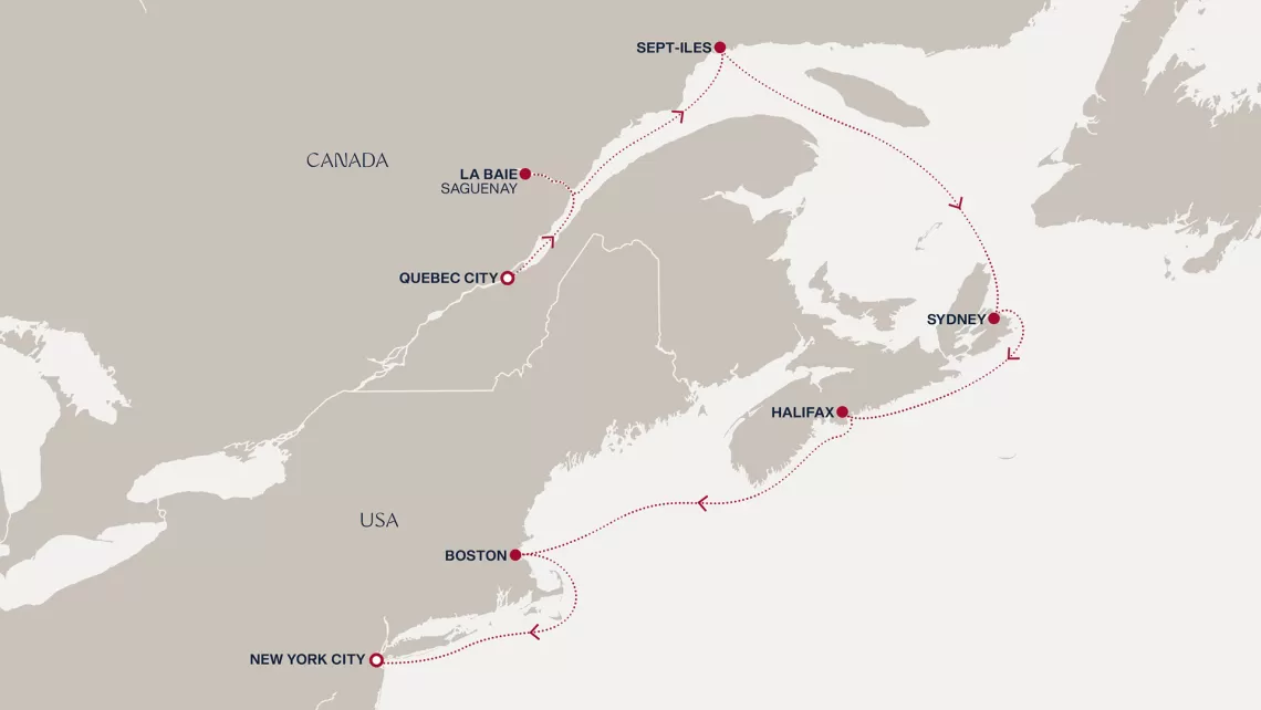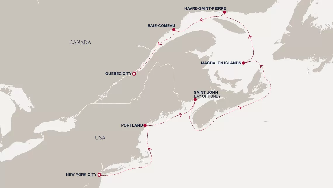 Маршрут круиза: Квебек - Сагеней - Сет-Иль - море - Шарлоттаун - Сидней - Галифакс - море - Ньюпорт - Нью-Йорк - море - Портленд - Сент-Джон - море - о. Мадлен - Авр-Сен-Пьер - Бэ-Комо - Квебек