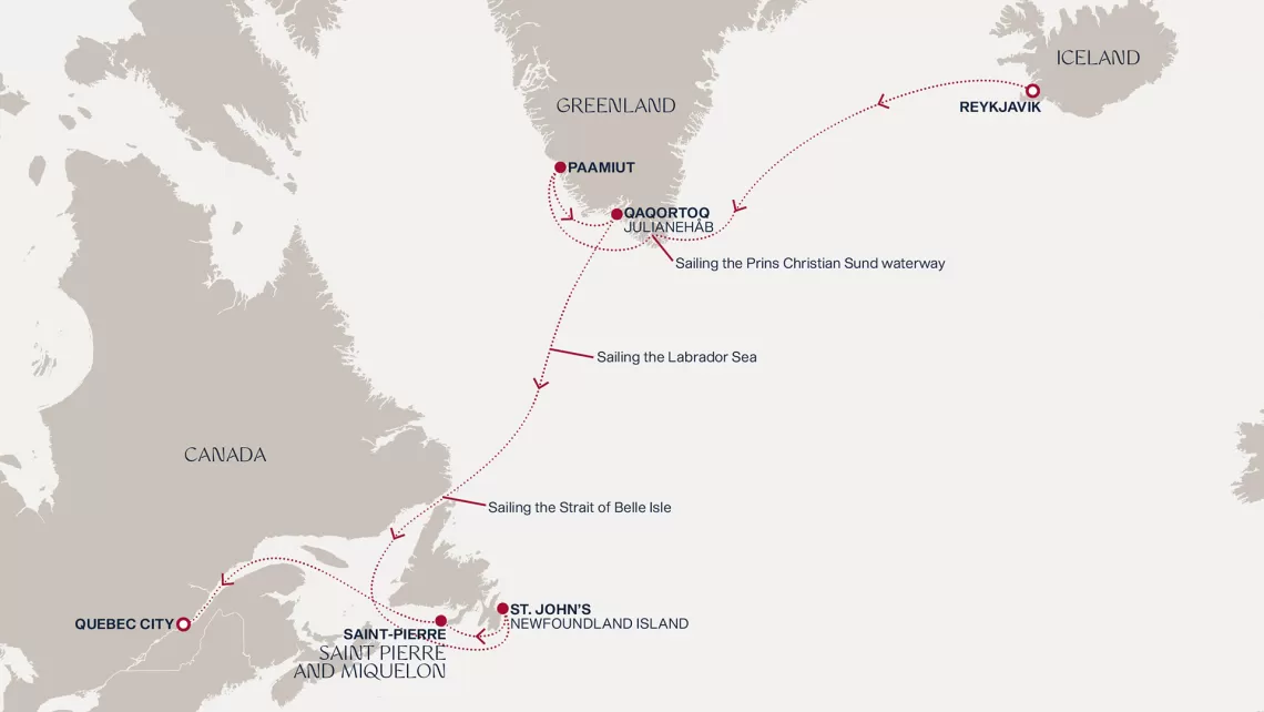 Маршрут круиза: Рейкьявик - море - пролив Принца Кристиана - Паамиут - Какорток - море - море - Сент-Джонс - Сен-Пьер, о. Сен-Пьер - море - Квебек - Квебек