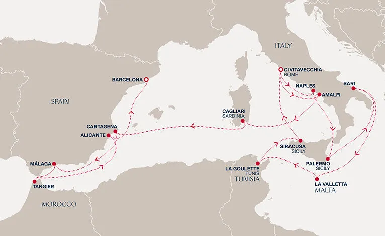 Маршрут круиза: Лас-Пальмас, о. Гран-Канария - Санта-Крус-де-ла-Пальма, о. Ла-Пальма - Санта-Крус-де-Тенерифе, о. Тенерифе - Пуэрто-дель-Росарио, о. Фуэртевентура - Фуншал, о. Мадейра - море - Аресифи, о. Лансароте - Лас-Пальмас, о. Гран-Канария