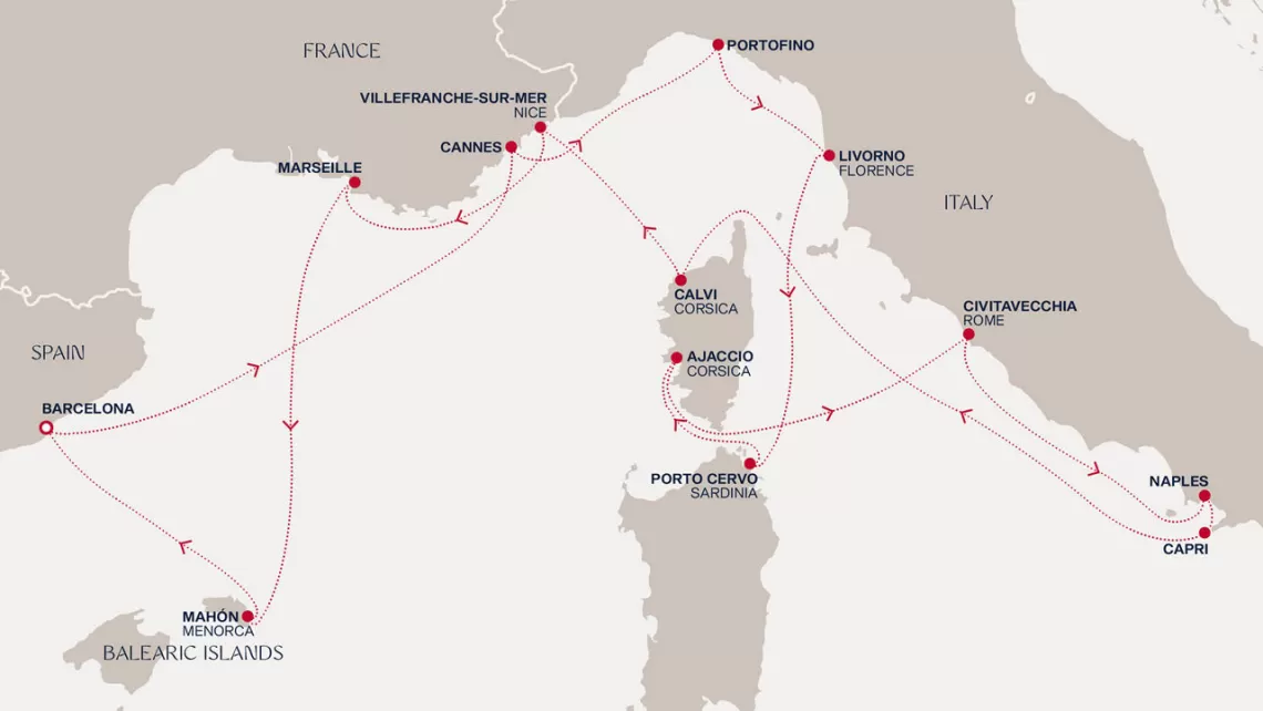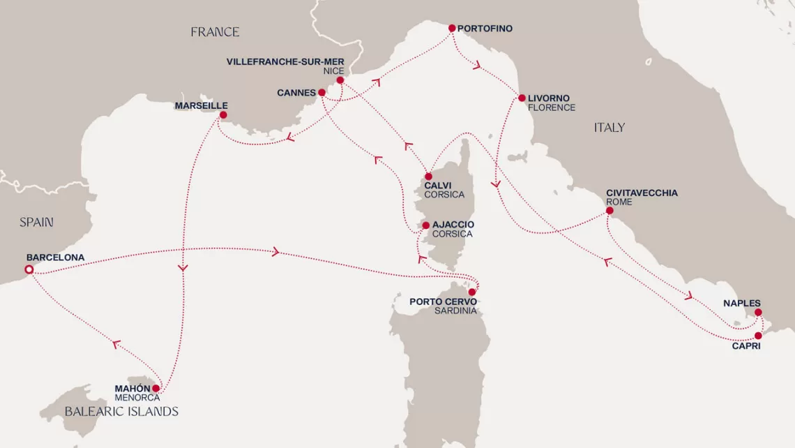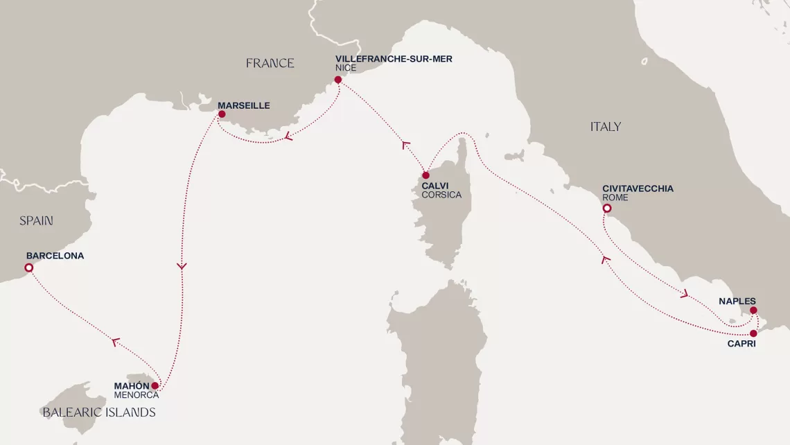 Маршрут круиза: Барселона - море - Порто Черво, о. Сардиния - Аяччо, о. Корсика - Сен-Тропе - Портофино - Ливорно / Флоренция, Пиза - Чивитавеккья / Рим - Неаполь / Помпеи - о. Капри - о. Капри - Кальви, о. Корсика - Вильфранш / Ницца - Марсель - Маон, о. Менорка - Барселона