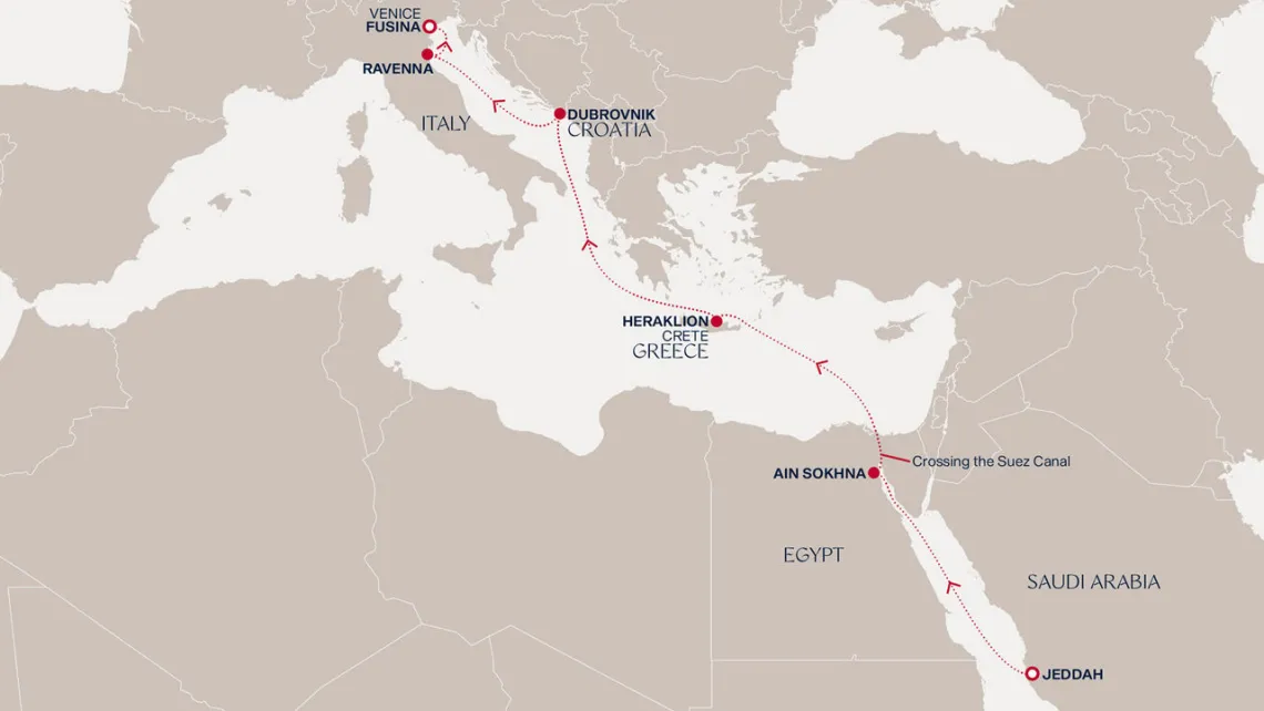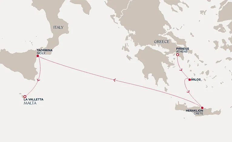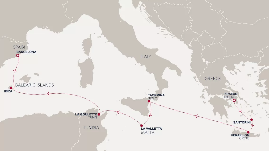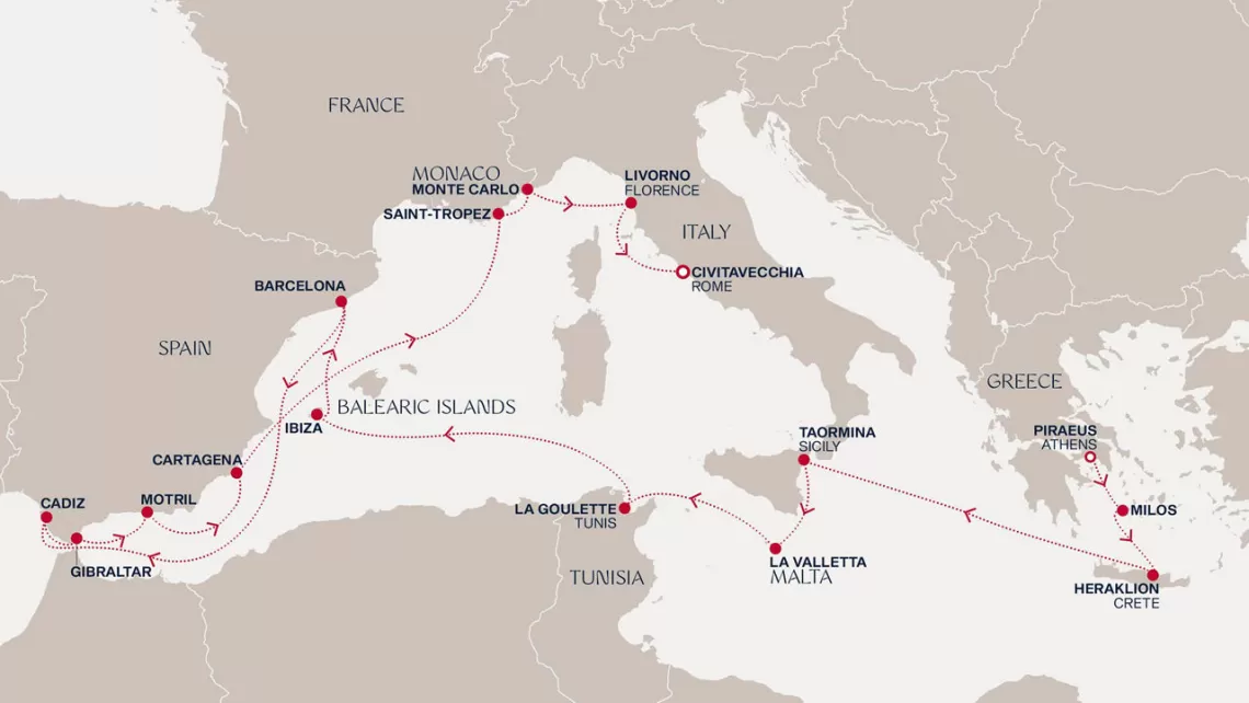 Маршрут круиза: Пирей / Афины - о. Милос - Ираклион, о.Крит - море - Джардини-Наксос, о. Сицилия - Валлетта - Ла-Гулетт - море - о. Ибица - Барселона - море - Кадиc / Севилья - Танжер - Мотриль - Картахена - море - Сен-Тропе - Монте-Карло - Ливорно / Флоренция, Пиза - Чивитавеккья / Рим