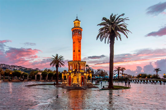 Измир, город на берегу Эгейского моря, - третий город Турции и приморский порт. Измир ведет летосчисление со времен существования античной цивилизации и считается родиной незабвенного Гомера. Среди достопримечательностей стоит отметить мечеть Яхлы, которая поражает туристов цветной кафельной плиткой, высокую 25-метровую Часовую башню, которая возвышается над городом на центральной площади Конак. Спускаясь в город, невозможно пройти мимо Археологического музея — истинной сокровищницы удивительных древностей, в том чилсе хранящих память греческих походов. Обязательно посетите дом-музей великого Ататюрка, под отважным предводительством которого Измир был вырван из рук Греции в начале 20-го века. Несмотря на то, что город принадлежит к наследию ислама, Измир собрал в себе места, относящиеся к иудейской культуре: здесь есть еврейский квартал Асанёр и синагоги. Парки с живописным пейзажем вряд ли оставят равнодушным кого-либо из гостей, приехавших в Измир. В прекрасном местечке Кюльтюрпарке можно прогуляться в тени раскидистых деревьев, посидеть в кафе или чайном домике. А вот в конце лета этот парк превращается в огромную разноцветную международную ярмарку, которая хорошо известна не только в самой Турции, но и за ее пределами.