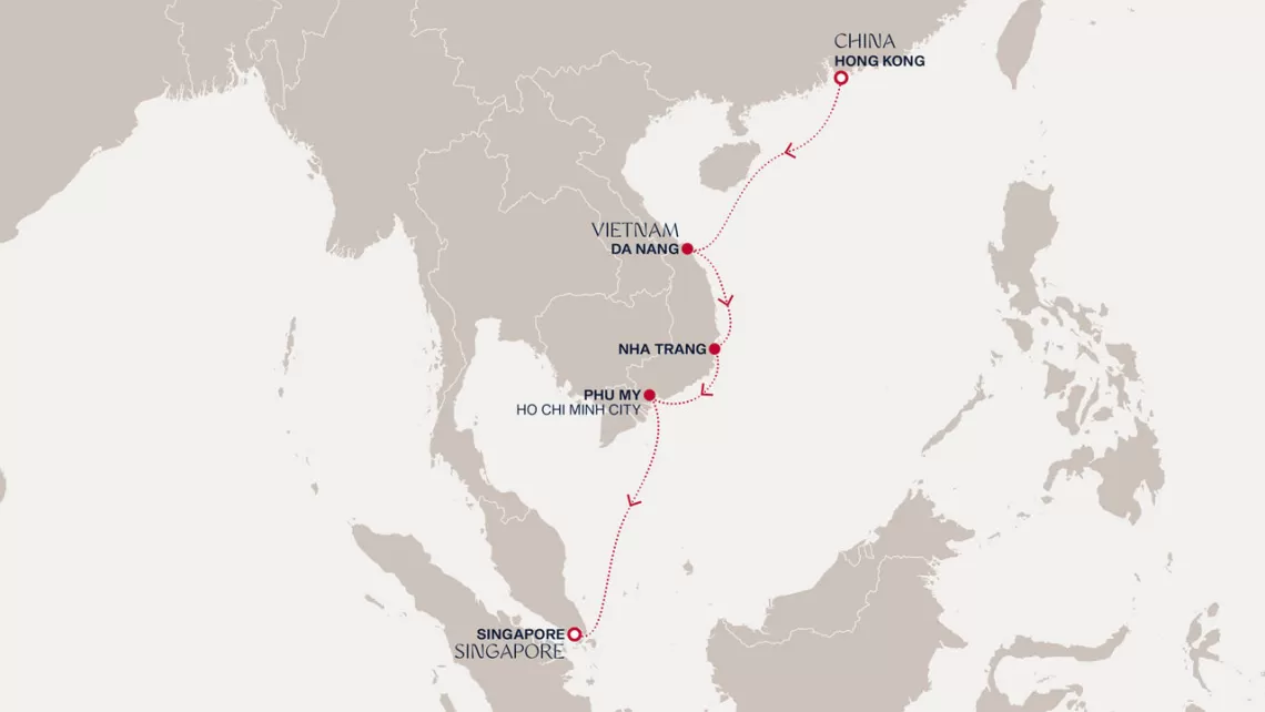 Маршрут круиза: Гонконг - море - Халонг Бэй / Ханой - Халонг Бэй / Ханой - Дананг - море - Нячанг - Пхи Ми - Пхи Ми - море - Сингапур