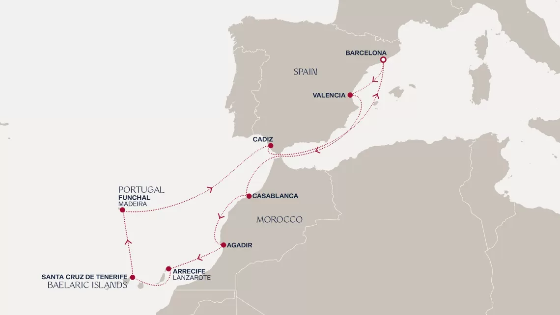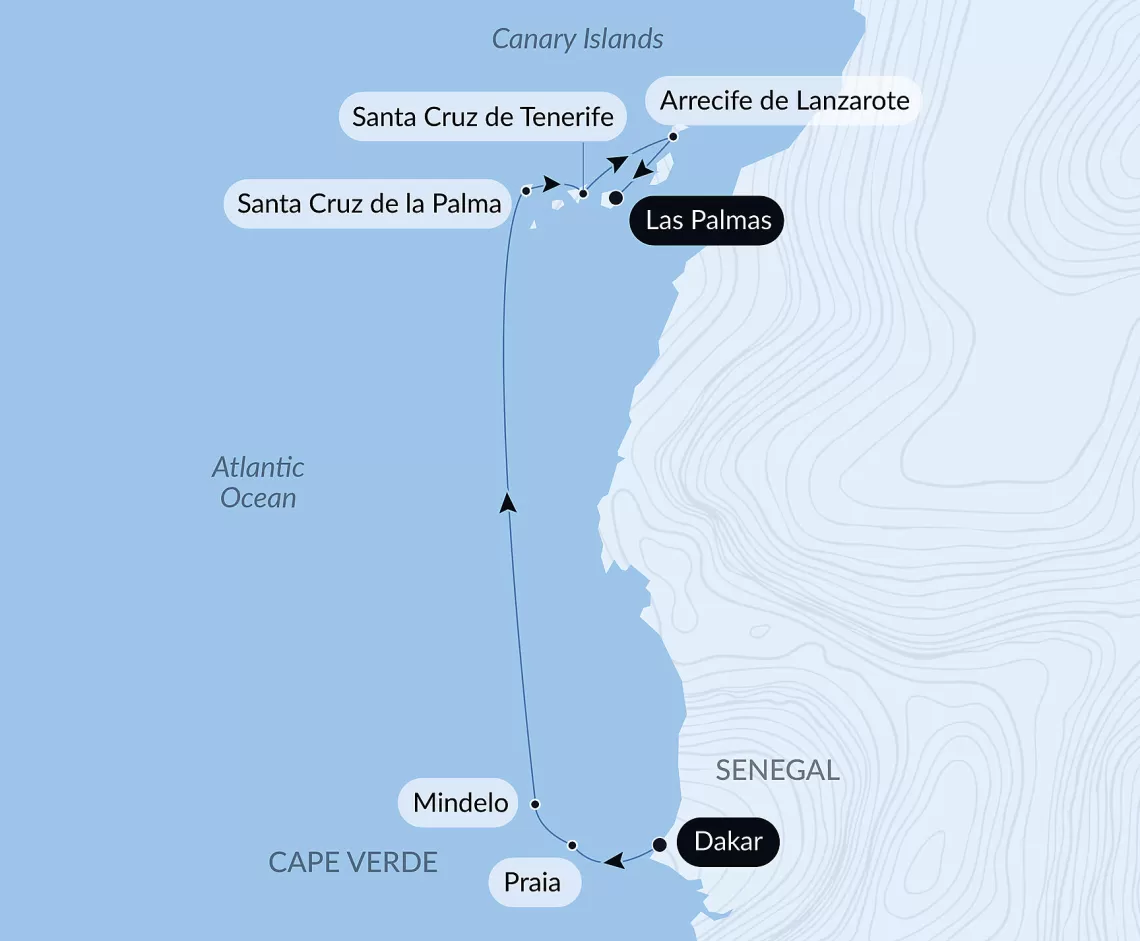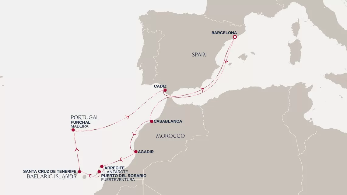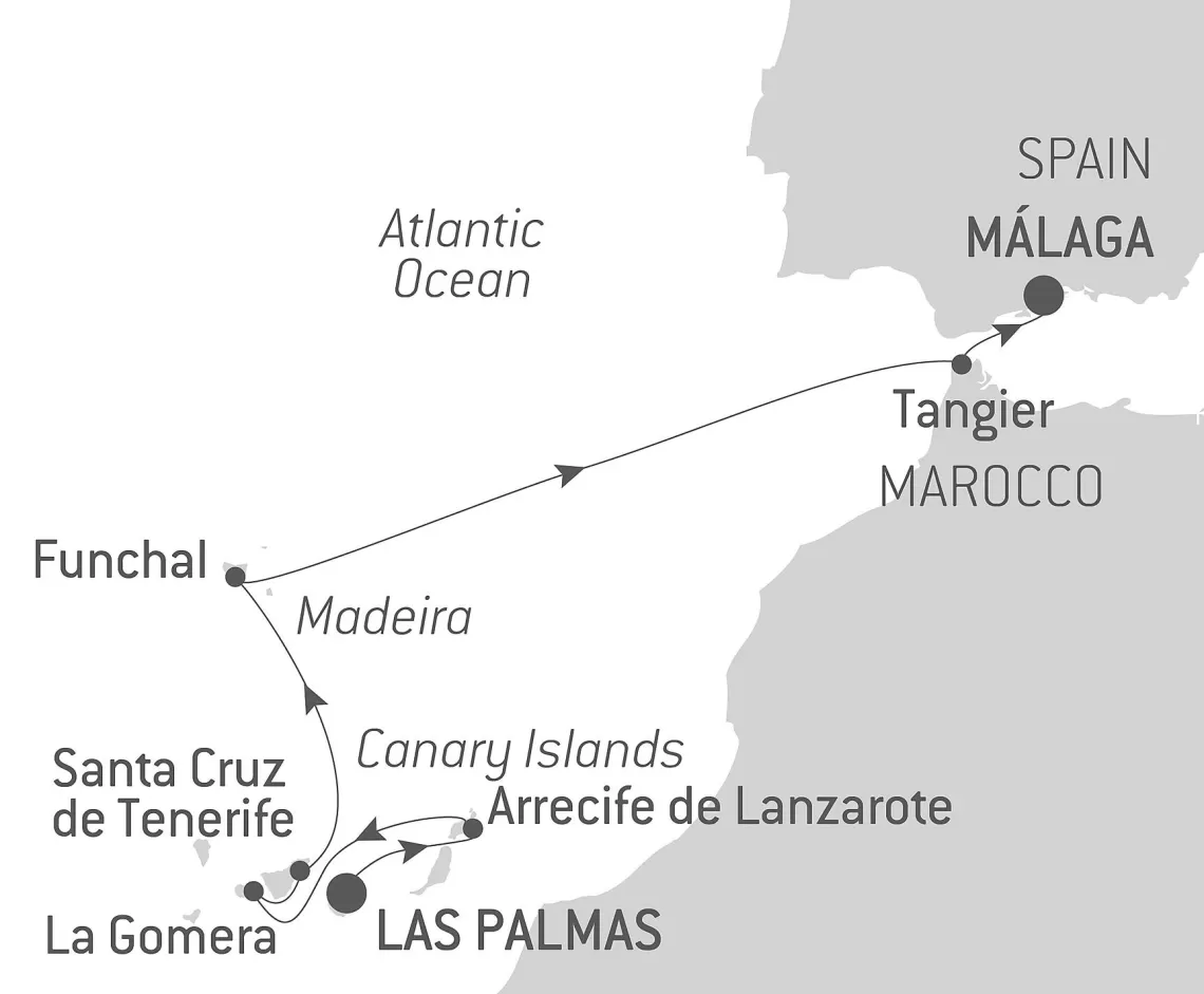 Маршрут круиза: Лас-Пальмас, о. Гран-Канария - Аресифи, о. Лансароте - Пуэрто-дель-Росарио, о. Фуэртевентура - Санта-Крус-де-Тенерифе, о. Тенерифе - море - Фуншал, о. Мадейра - Фуншал, о. Мадейра - Пуэрто де ла Эстака, о. Иерро - Сан-Себастьян-де-ла-Гомера - Санта-Крус-де-ла-Пальма, о. Ла-Пальма - Лас-Пальмас, о. Гран-Канария