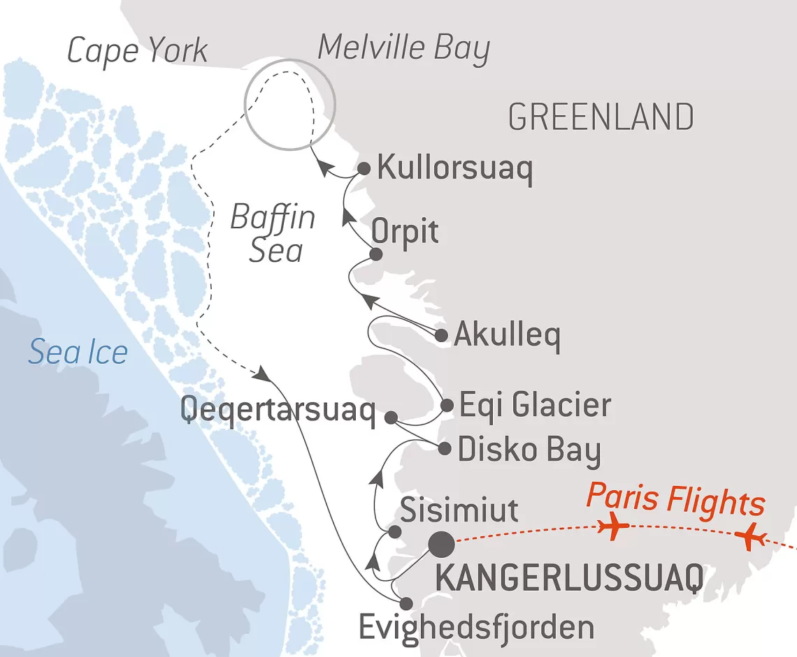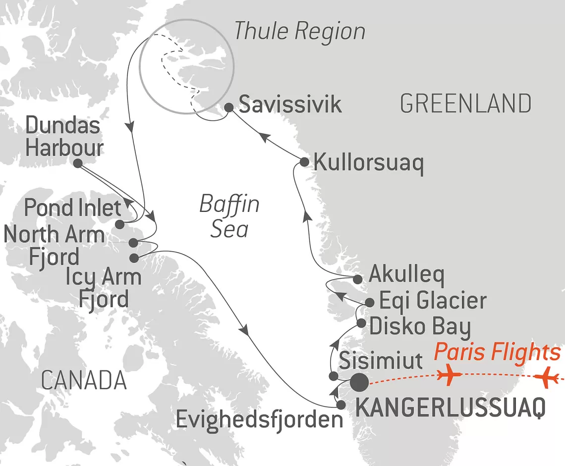 Маршрут круиза: Кангерлуссуак - Сисимиут - залив Диско - База Поля-Эмиля Виктора - Аккулек - Куллорсуак - Сависсивик - Туле - Туле - море - Понд-Инлет - море Баффина - море - море - Нуук - Кангерсуатсиак - Кангерлуссуак