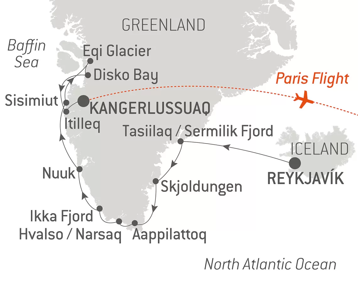 Маршрут круиза: Рейкьявик - Рейкьявик - море - Ангмагссалик - фьорд Сермилик - фьорд Скольдунген - пролив Принца Кристиана - Хвалси - Игалику - фьорд Икка - Нуук - Сисимиут - База Поля-Эмиля Виктора - залив Диско - полуостров Нооралак - Нуук