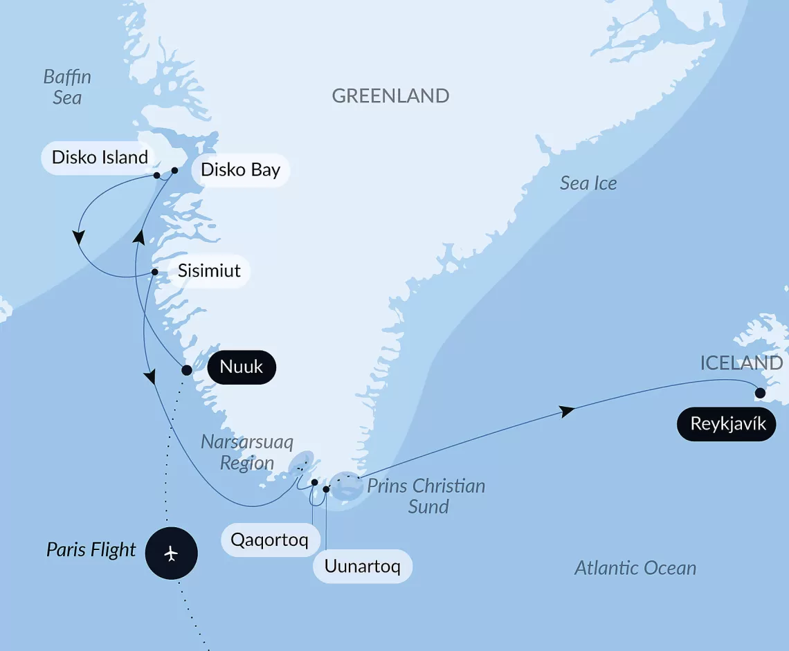 Маршрут круиза: Нуук - море Баффина - море Баффина - залив Диско - о. Диско - о. Диско - Сисимиут - Сисимиут - море Баффина - Нарсарсуак - Какорток - о. Уунарток - Ааппилатток - пролив Принца Кристиана - пролив Принца Кристиана - ледник Куяллек - море - море - Рейкьявик