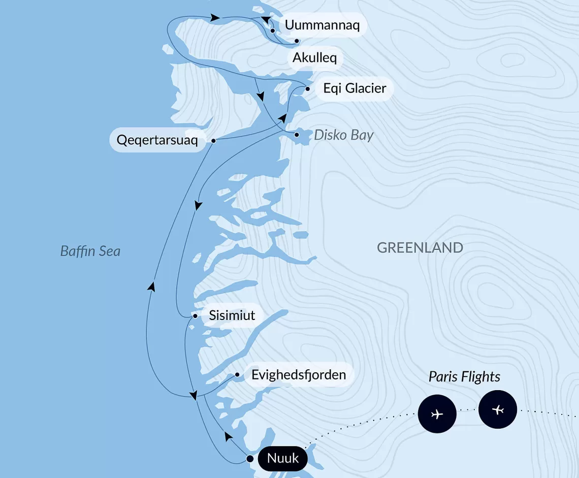 Маршрут круиза: Нуук - Кангерсуатсиак - Кекертарсуак - База Поля-Эмиля Виктора - Аккулек - Уумманнак - залив Диско - Сисимиут - море - Нуук