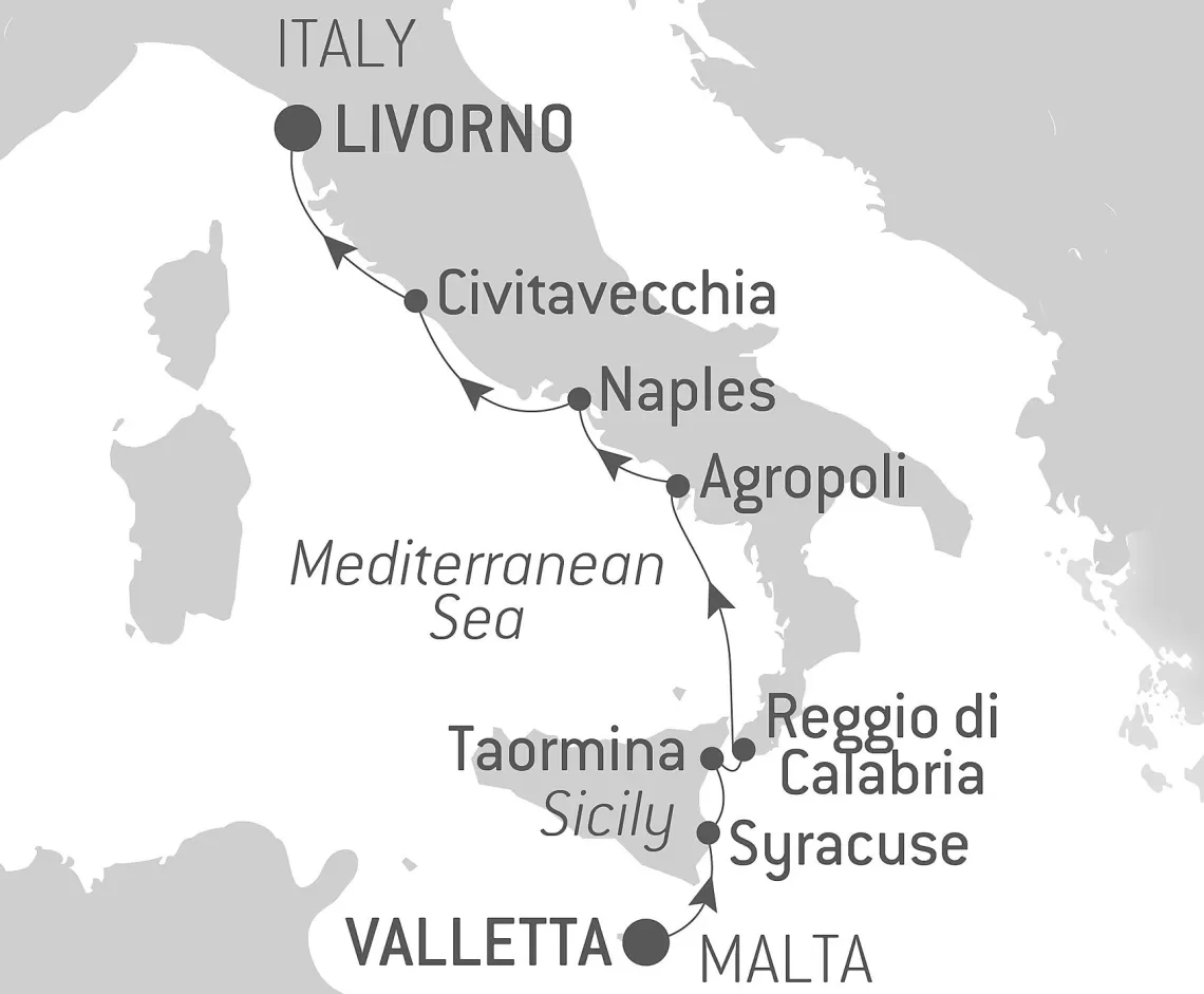 Маршрут круиза: Валлетта - Порт Эмпедокле, о. Сицилия - Трапани, о. Сицилия - Палермо, о. Сицилия - о. Липари - о. Стромболи - Салерно - Реджо-ди-Калабрия - Таормина, о. Сицилия - Сиракузы, о. Сицилия - Валлетта