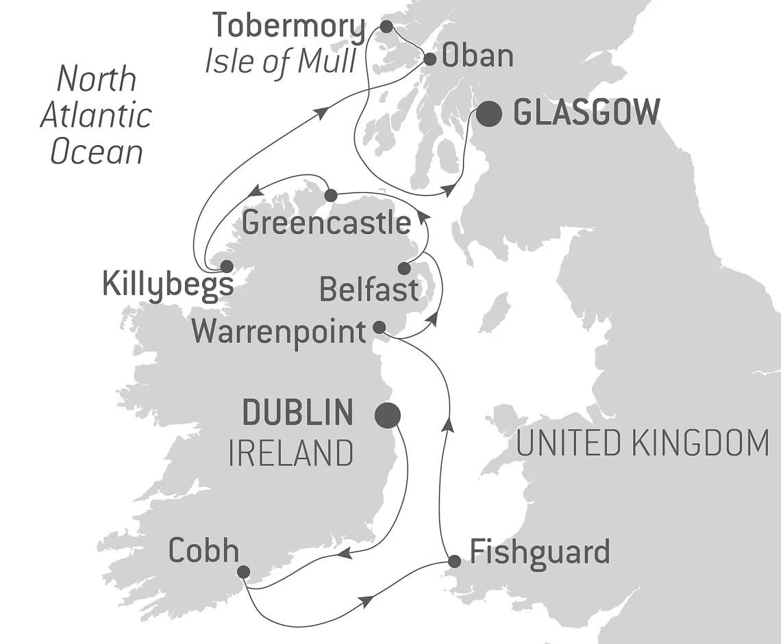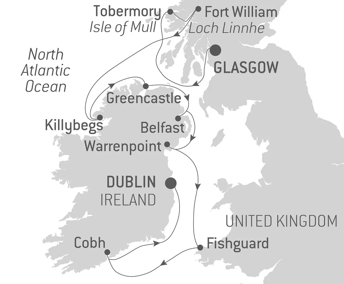 Маршрут круиза: Гринок / Глазго - Тобермори - Форт-Уильям - озеро Лох-Линне - Киллибегс - Гринкасл - Белфаст - Уорренпойнт - Фишгард - Ков - Дублин