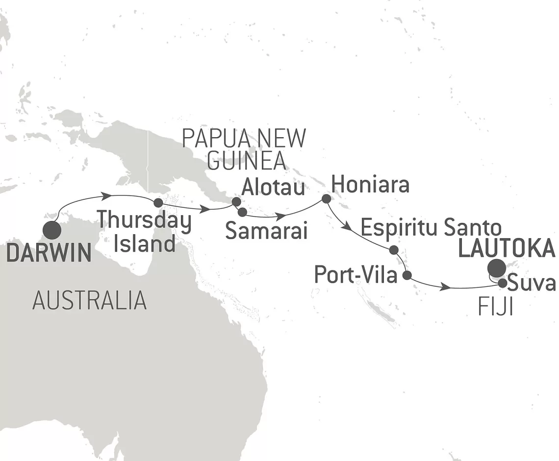 Маршрут круиза: Дарвин - море - море - о. Терсди-Айленд - море - Алотау - о. Самарай - море - Хониара - Хониара - море - море - о. Эспириту-Санто - Порт-Вила - море - море - море - Лаутока, о. Вити-Леву