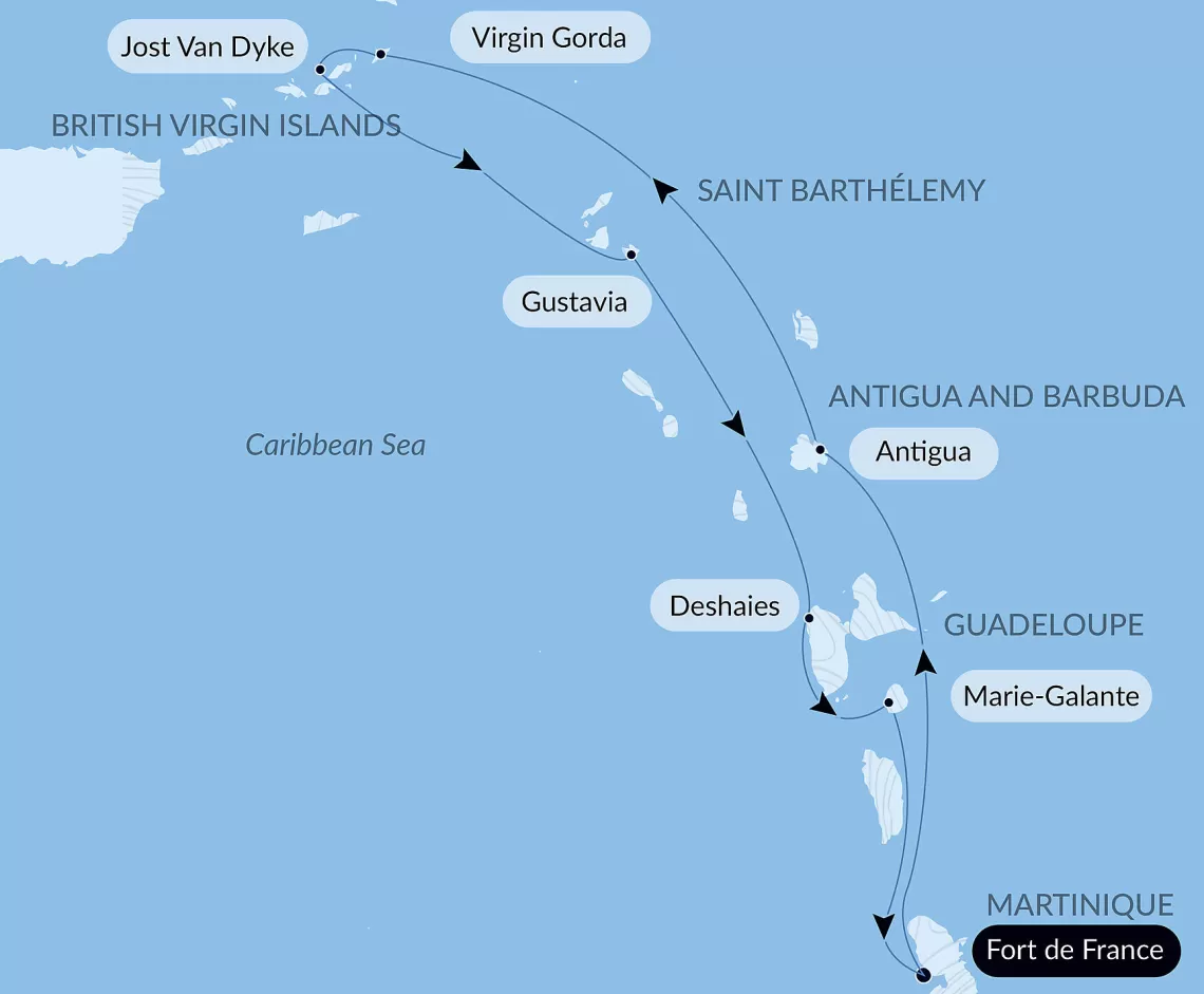 Маршрут круиза: Фор-де-Франс, о. Мартиника - Сент-Джонс, о.Антигуа - о. Верджин-Горда - о. Йост-Ван-Дайк - Густавия, о. Сен-Бартельми - Деше, о. Гваделупа - о. Мари-Галант, Гваделупа - Фор-де-Франс, о. Мартиника