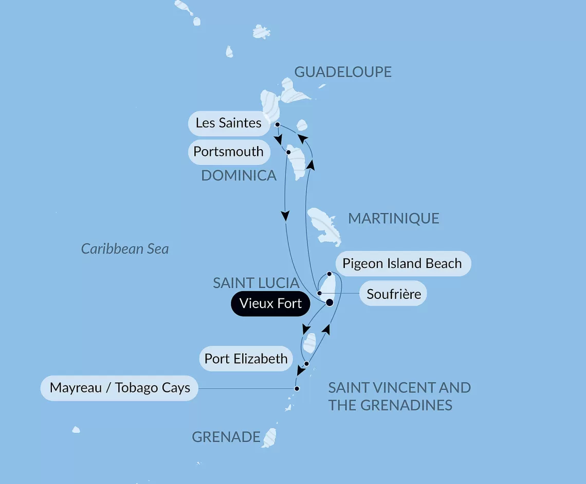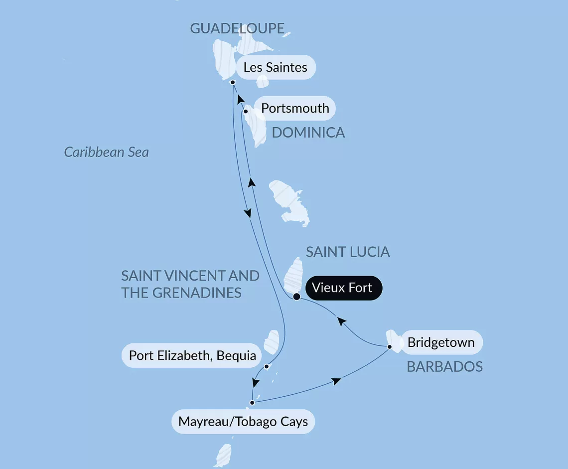 Маршрут круиза: Вьё-Фор, о. Сент-Люсия - Портсмут - о. Ле-Сент, Гваделупа - Порт-Элизабет, о. Бекия - о. Меро - Архипелаг Тобаго-Кейс - Бриджтаун, о. Барбадос - Вьё-Фор, о. Сент-Люсия