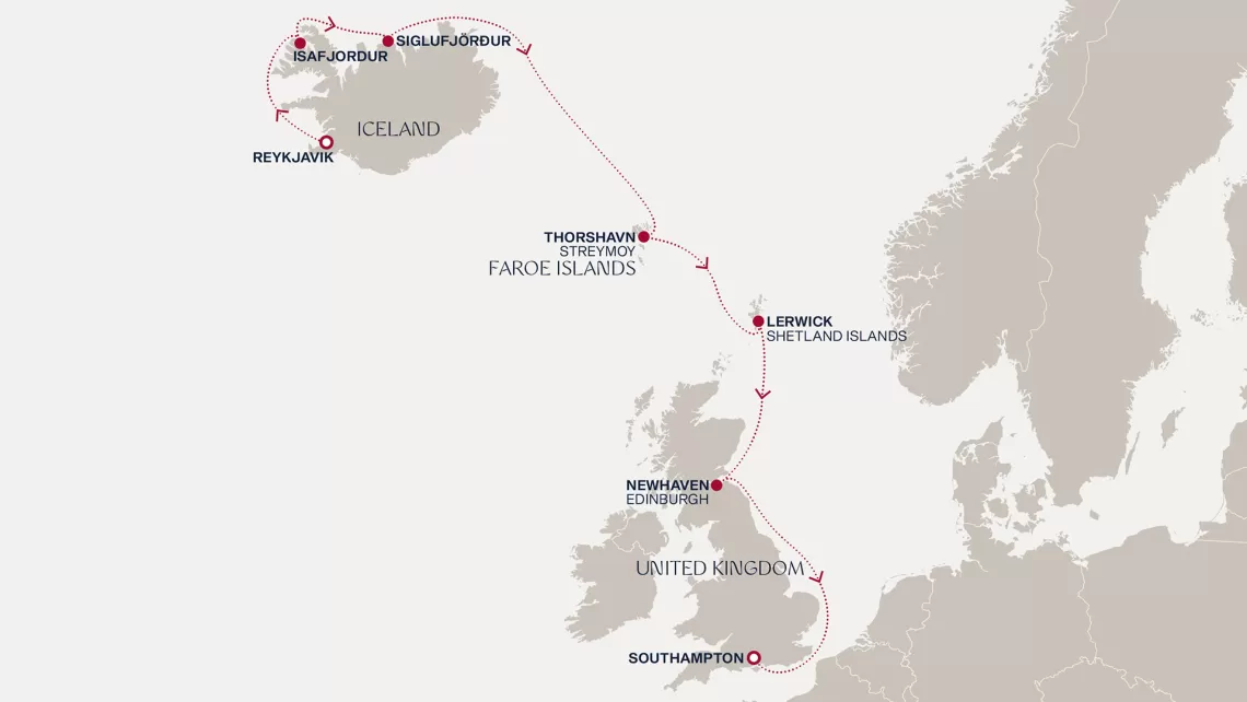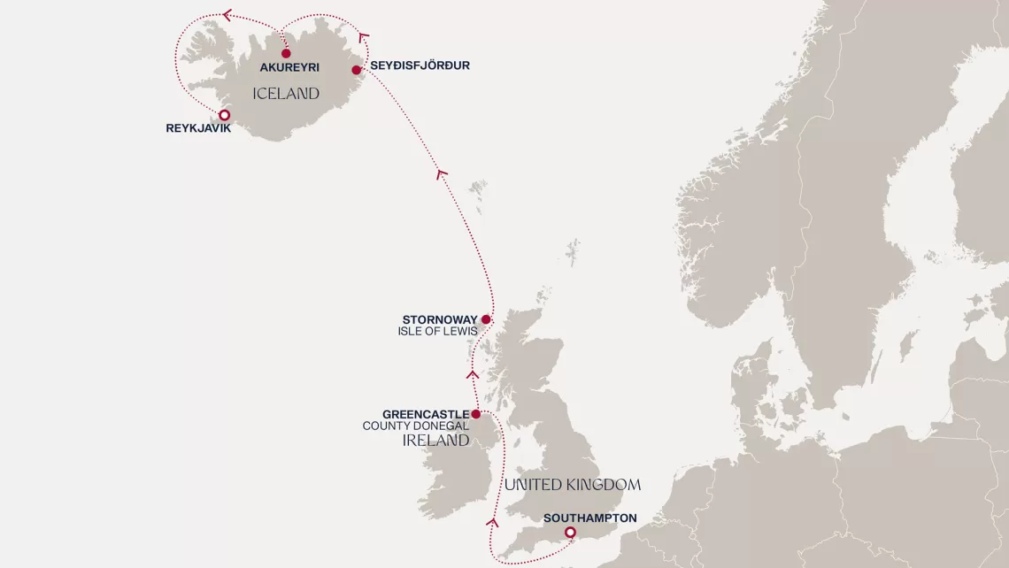 Маршрут круиза: Корк - море - море - Акюрейри - Исафьордюр - Рейкьявик - Рейкьявик - море - Молёй - Хеллесильт - Ставангер - море - Саутгемптон / Лондон
