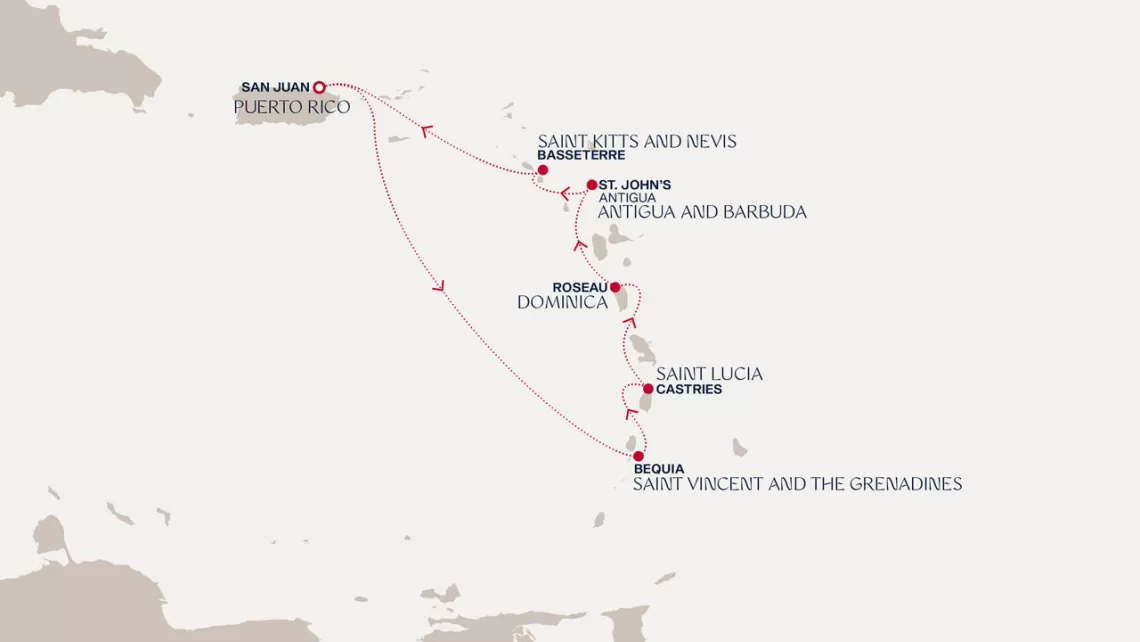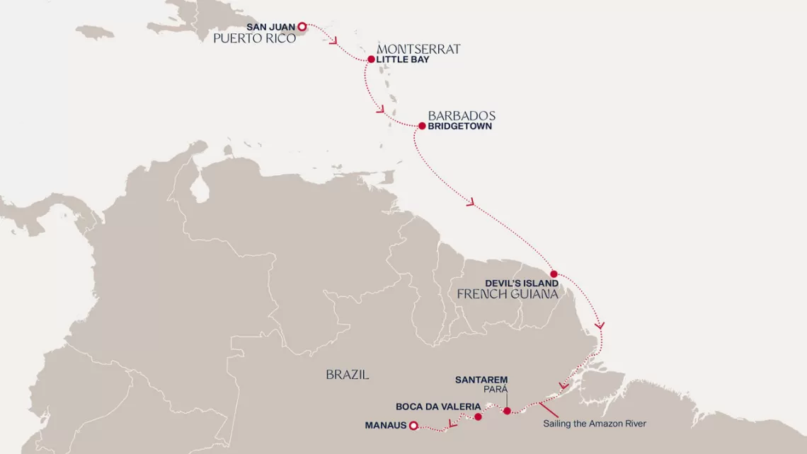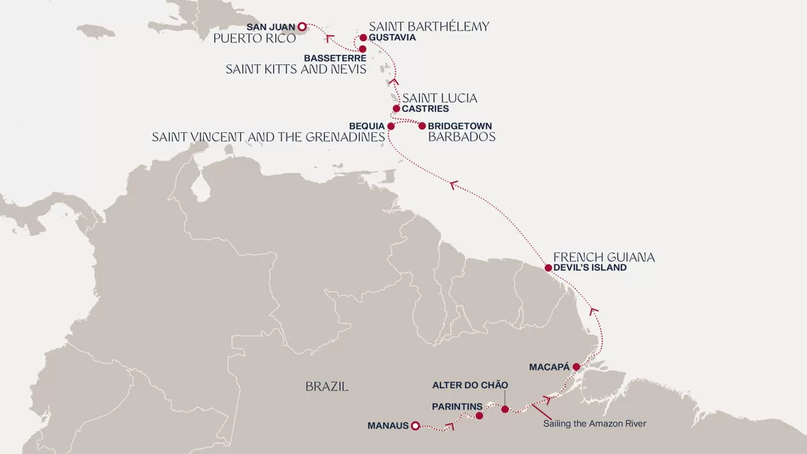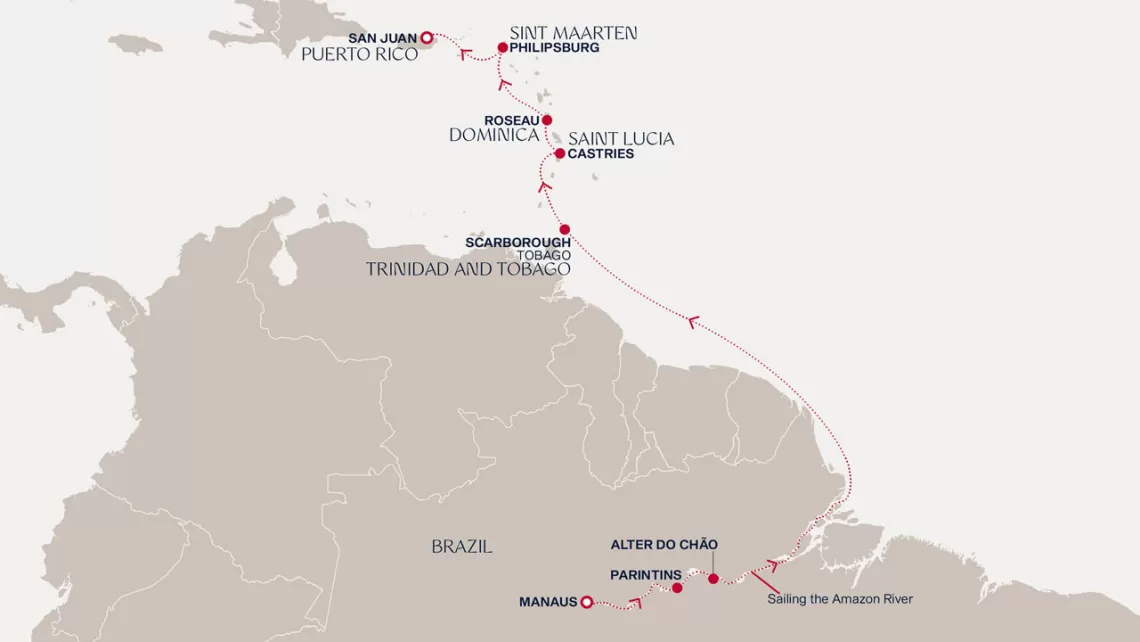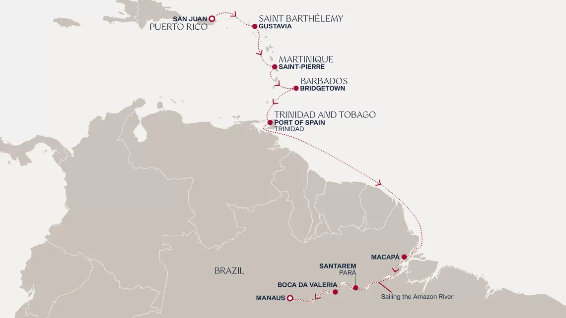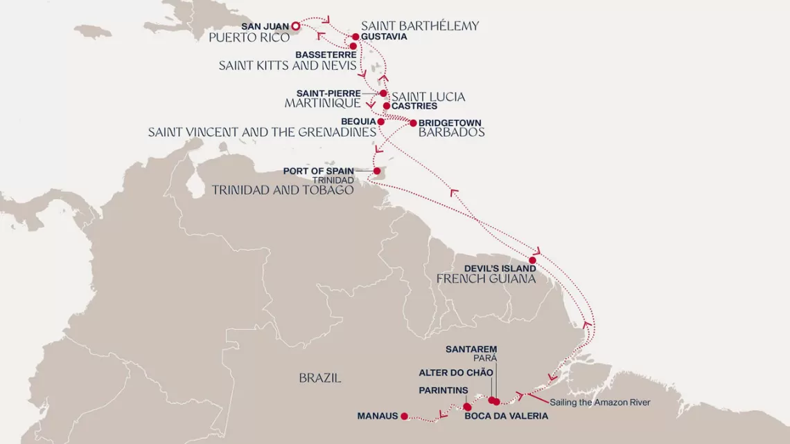Маршрут круиза: Сан-Хуан - Густавия, о. Сен-Бартельми - Сен-Пьер, о. Мартиника - Бриджтаун, о. Барбадос - Порт-оф-Спейн, о. Тринидад - Порт-оф-Спейн, о. Тринидад - море - море - Макапа - Сантарен - Бока-де-Валерия - Манаус - Манаус - Паринтинс - Альтер до Чао - Макапа - море - о. Дьябль - море - о. Бекия - Бриджтаун, о. Барбадос - Кастри, о. Сент-Люсия - Густавия, о. Сен-Бартельми - Бастер, о. Сент-Китс - Сан-Хуан