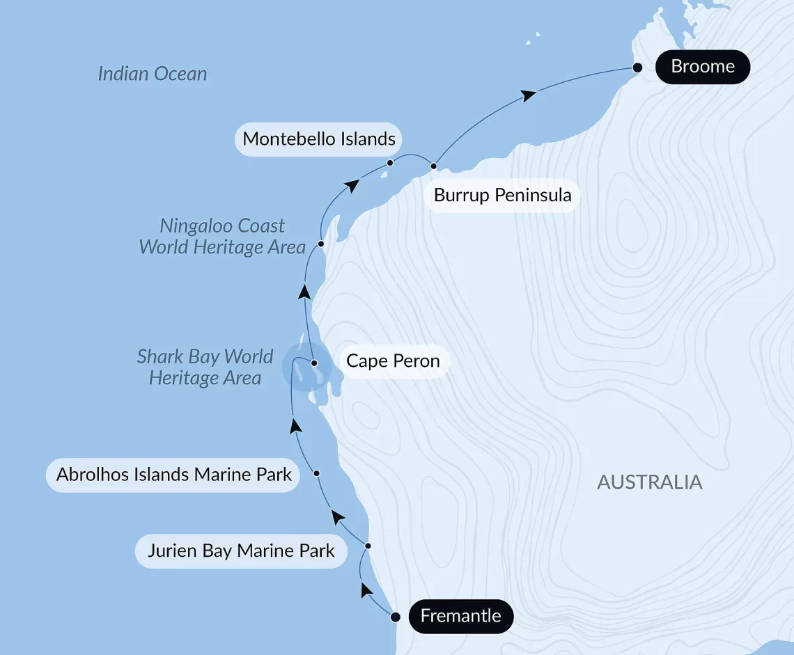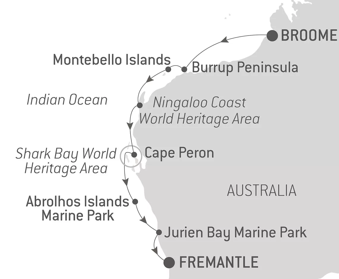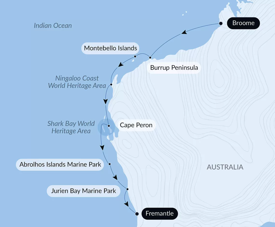 Маршрут круиза: Фримантл - Джуриен Бэй национальный морской парк - Аброльос национальный морской парк - Залив Шарк - Мыс Перон - Нингалу Риф - Нингалу Риф - острова Монтебелло - полуостров Берруп - море - Брум