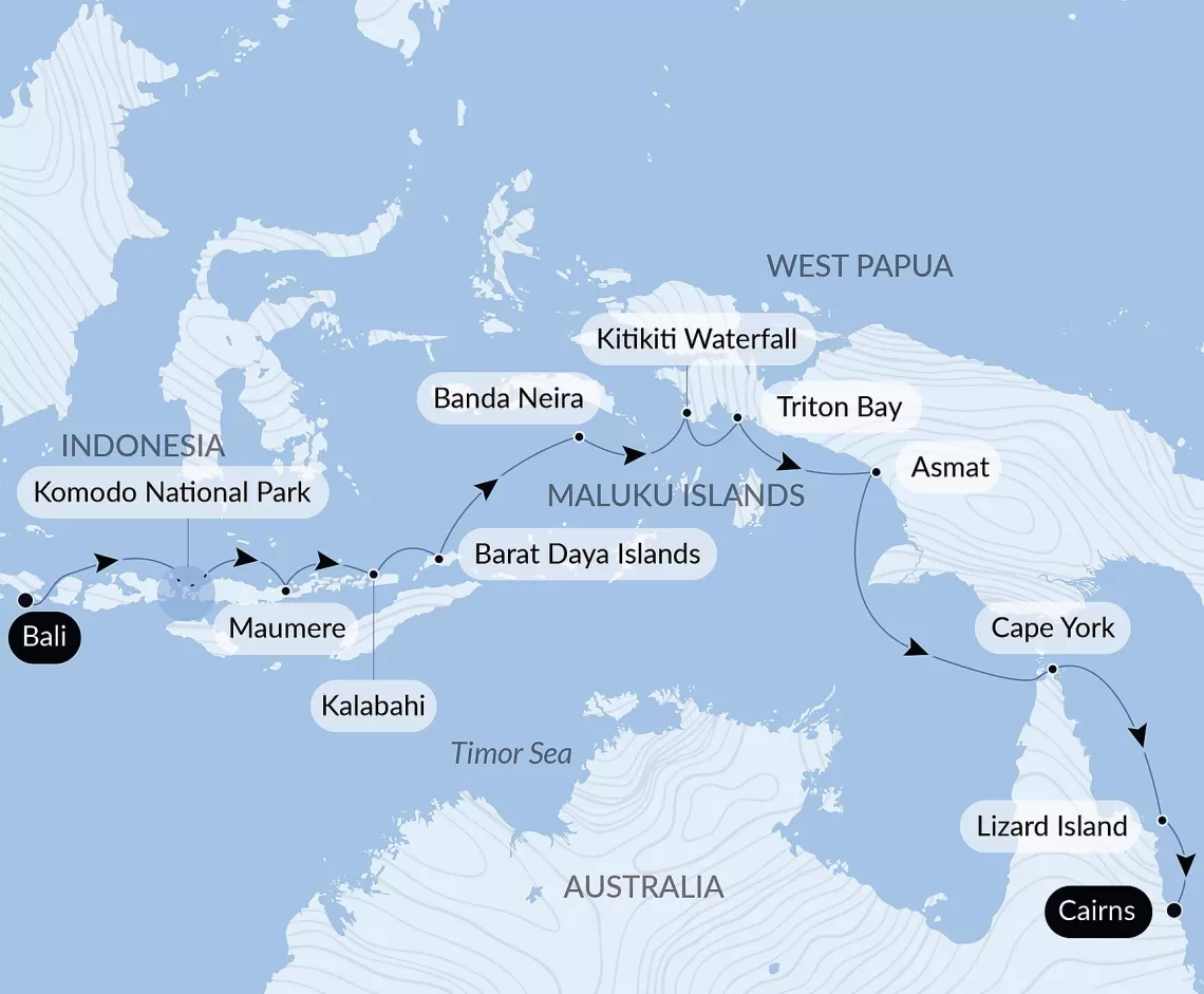 Маршрут круиза: Беноа, о. Бали - море - о. Комодо - Маумере, о. Флорес - Калабахи, о. Алор - остров Барат-Дая - Банданейра, о. Банда - водопад Кити-Кити, Западное Папуа - Залив Тритон - море - Асмат - море - Кейп-Йорк - море - о. Лайзард - Кэрнс