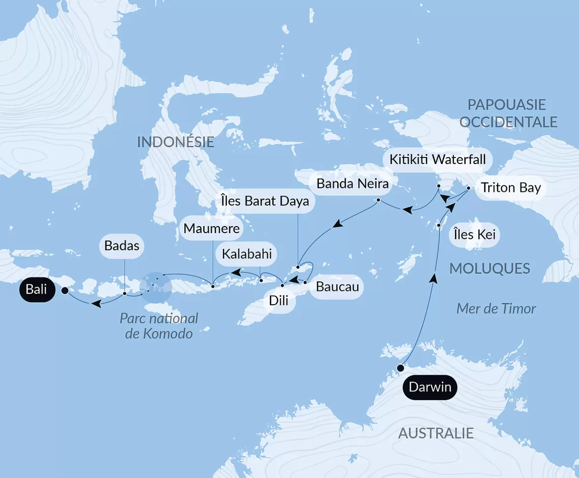 Маршрут круиза: Беноа, о. Бали - о-ва Бадас - о. Комодо - Маумере, о. Флорес - Калабахи, о. Алор - остров Барат-Дая - Банданейра, о. Банда - водопад Кити-Кити, Западное Папуа - Залив Тритон - о-ва Кай - море - Дили, о. Тимор - море - Дарвин