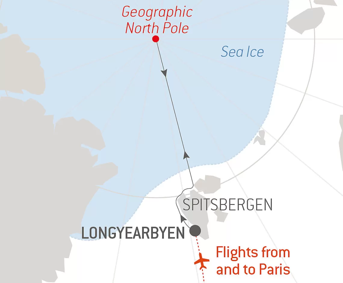 Маршрут круиза: Лонгийр - Проход вдоль Шпицбергена - Проход сквозь морские льды - Проход сквозь морские льды - Проход сквозь морские льды - Географический Северный Полюс - Географический Северный Полюс - Проход сквозь морские льды - Проход сквозь морские льды - Проход сквозь морские льды - Ню-Олесунн - Северо-Западный регион Шпицбергена - Лонгийр