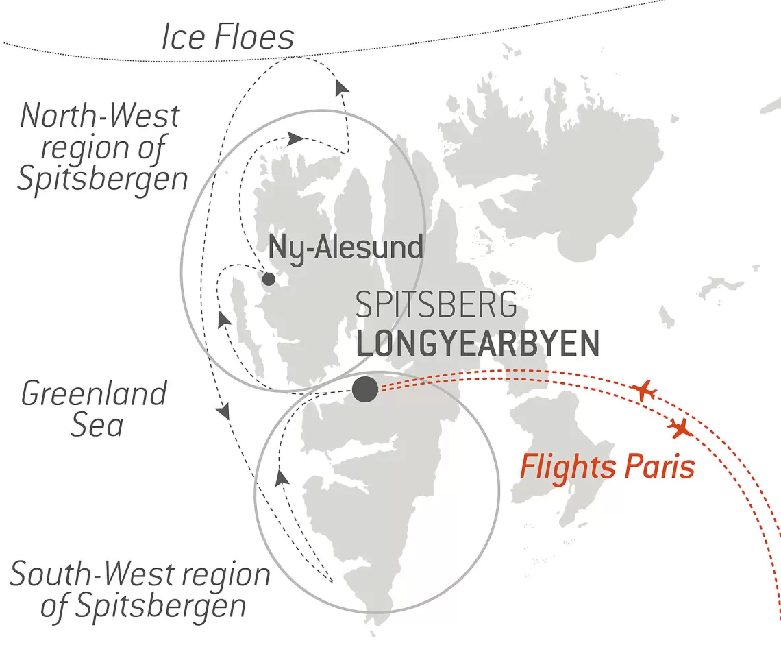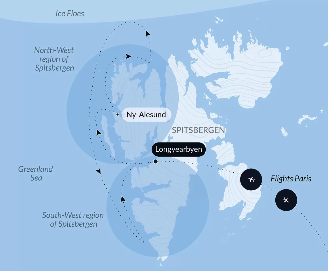 Маршрут круиза: Лонгийр - залив Самаринваген - залив Варсолбукта - проход среди льдов - Лифдефьорд - Раудфьорд - Ню-Олесунн - Лонгийр