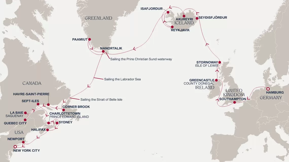 Маршрут круиза: Гамбург - море - Саутгемптон / Лондон - море - Гринкасл - Сторновей - море - Сейдисфьордюр - Акюрейри - Рейкьявик - Рейкьявик - Исафьордюр - море - пролив Принца Кристиана - Паамиут - Нанорталик - море - море - Корнер-Брук - Авр-Сен-Пьер - Квебек - Квебек - Сагеней - Сет-Иль - море - Шарлоттаун - Сидней - Галифакс - море - Ньюпорт - Нью-Йорк