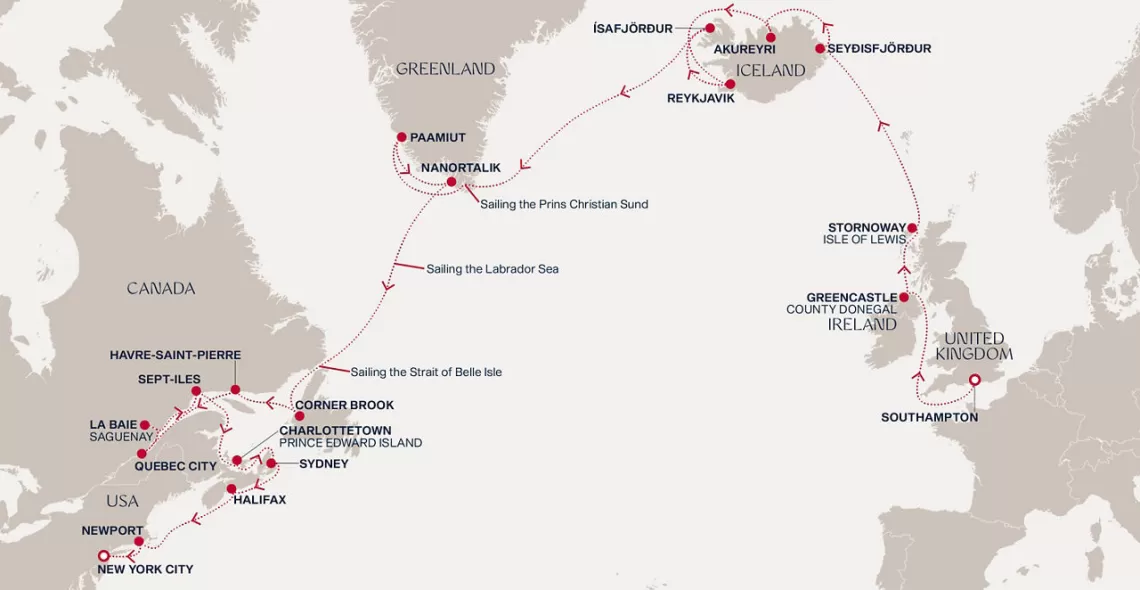 Маршрут круиза: Саутгемптон / Лондон - море - Гринкасл - Сторновей - море - Сейдисфьордюр - Акюрейри - Рейкьявик - Рейкьявик - Исафьордюр - море - пролив Принца Кристиана - Паамиут - Нанорталик - море - море - Корнер-Брук - Авр-Сен-Пьер - Квебек - Квебек - Сагеней - Сет-Иль - море - Шарлоттаун - Сидней - Галифакс - море - Ньюпорт - Нью-Йорк
