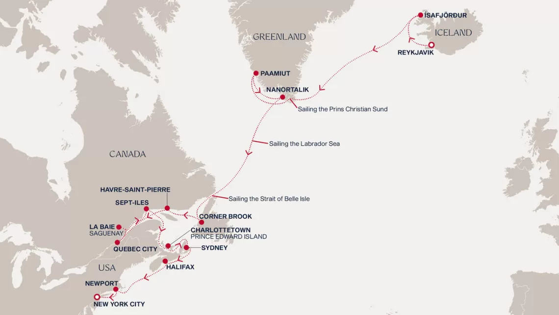 Маршрут круиза: Рейкьявик - Исафьордюр - море - пролив Принца Кристиана - Паамиут - Нанорталик - море - море - Корнер-Брук - Авр-Сен-Пьер - Квебек - Квебек - Сагеней - Сет-Иль - море - Шарлоттаун - Сидней - Галифакс - море - Ньюпорт - Нью-Йорк