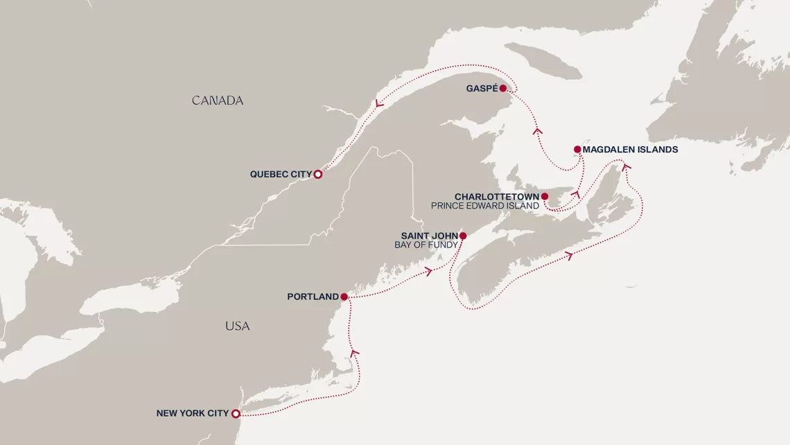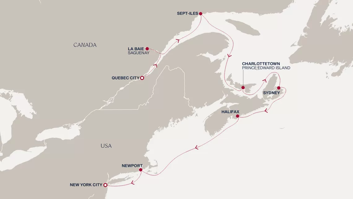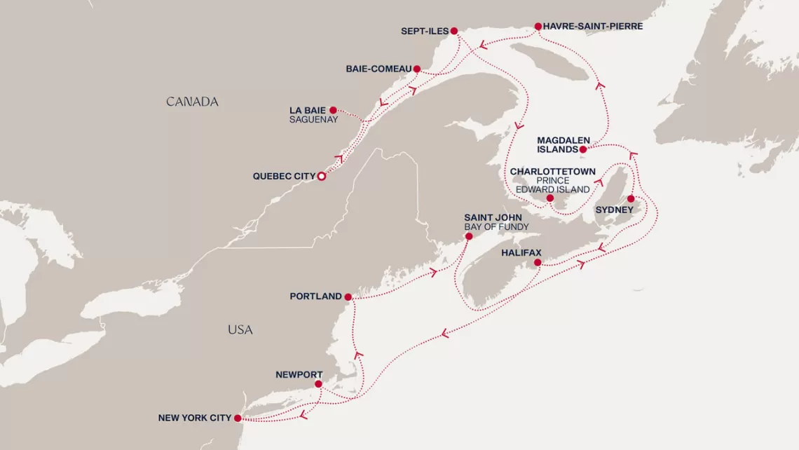 Маршрут круиза: Квебек - Сагеней - Сет-Иль - море - Шарлоттаун - Сидней - Галифакс - море - Ньюпорт - Нью-Йорк - море - Портленд - Сент-Джон - море - о. Мадлен - Авр-Сен-Пьер - Бэ-Комо - Квебек