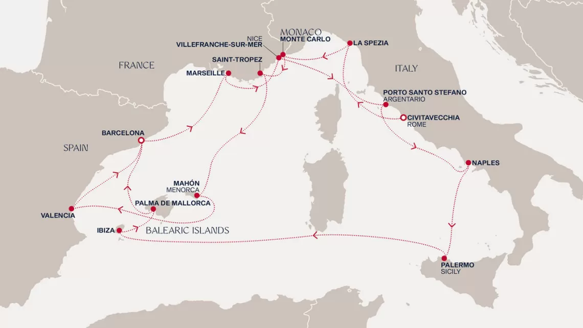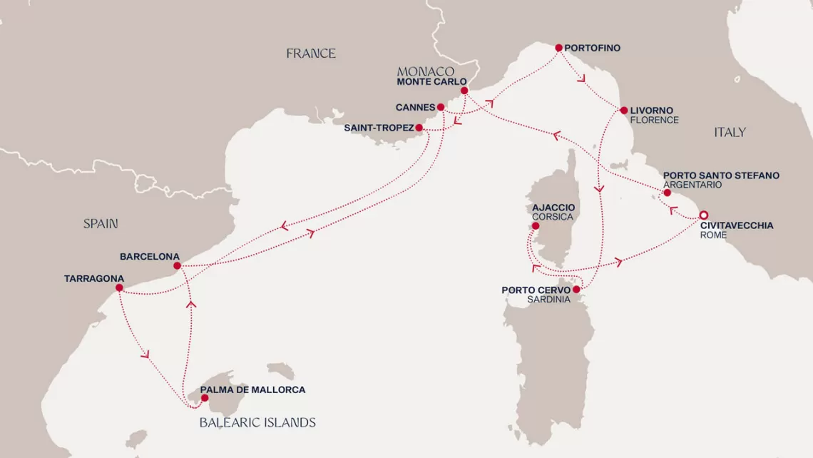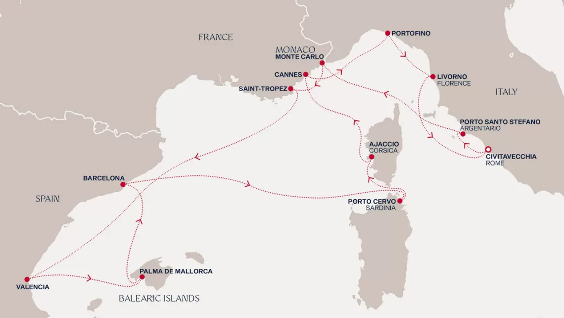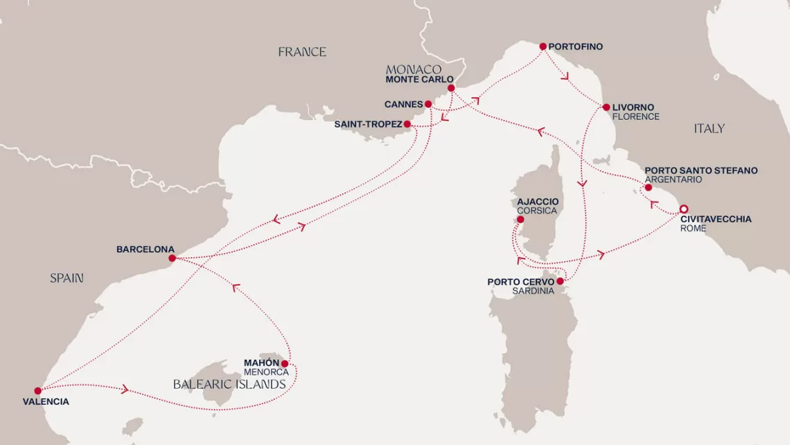 Маршрут круиза: Чивитавеккья / Рим - Порто Санто Стефано - Монте-Карло - Сен-Тропе - море - Валенсия - Маон, о. Менорка - Барселона - море - Канны - Портофино - Ливорно / Флоренция, Пиза - Порто Черво, о. Сардиния - Аяччо, о. Корсика - Чивитавеккья / Рим