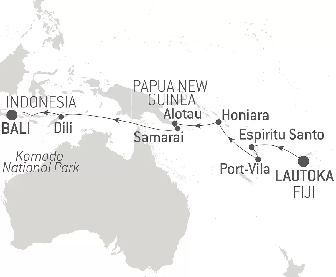 Маршрут круиза: Лаутока, о. Вити-Леву - море - море - о. Эспириту-Санто - Порт-Вила - море - море - Хониара - море - Алотау - о. Самарай - море - море - море - море - Дили, о. Тимор - море - о. Комодо - море - Беноа, о. Бали - Беноа, о. Бали