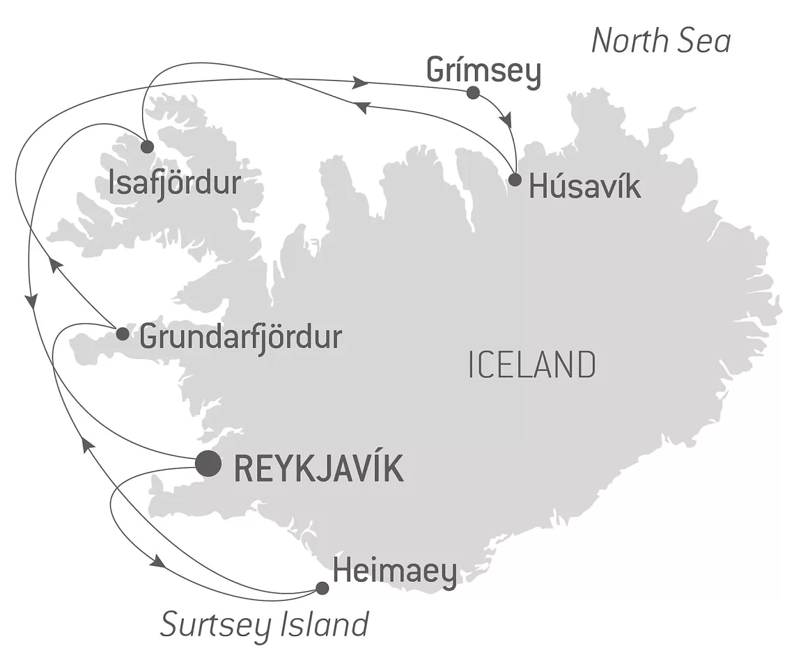Маршрут круиза: Рейкьявик - Рейкьявик - Вестманнаэйяр архипелаг - Вестманнаэйяр архипелаг - Грундарфьордюр - море - Акюрейри - Исафьордюр - Рейкьявик