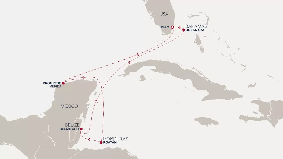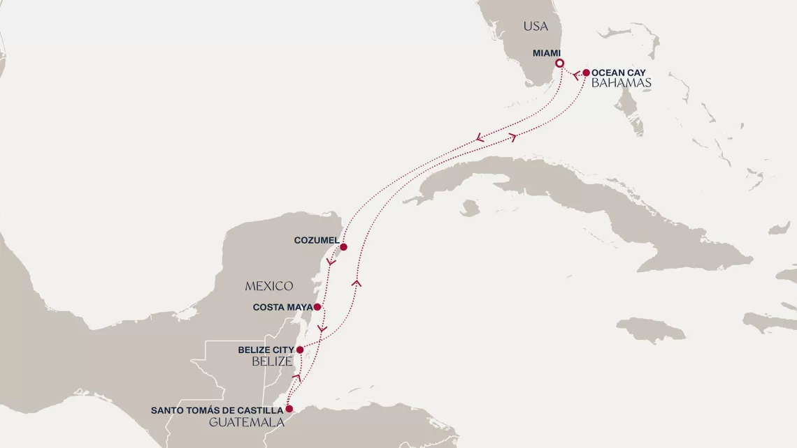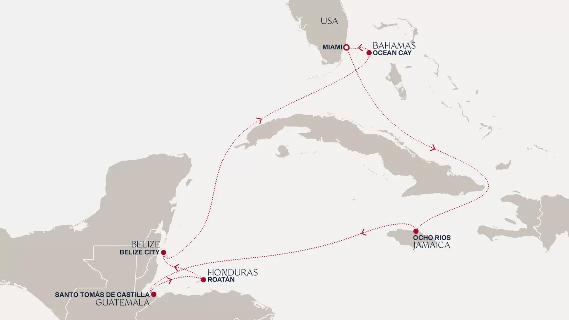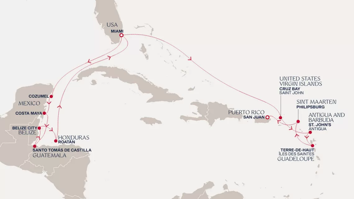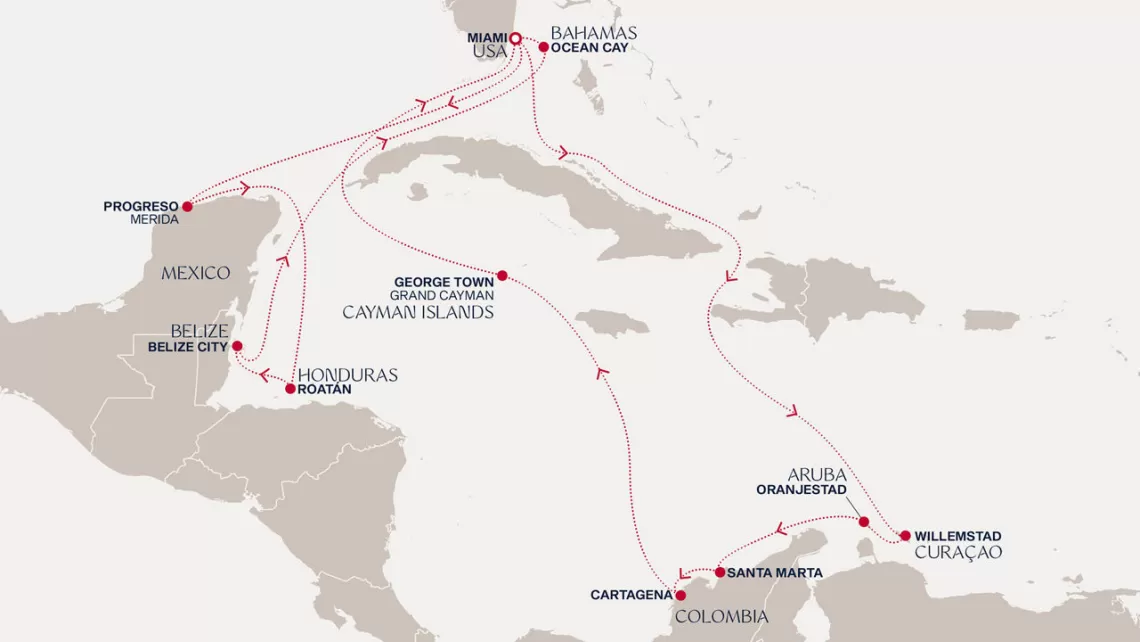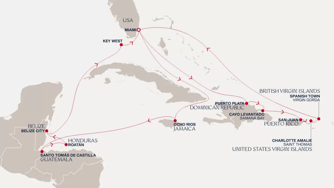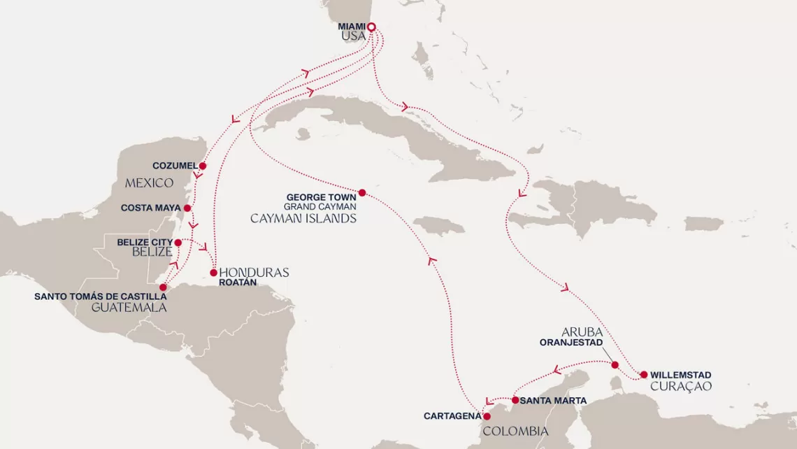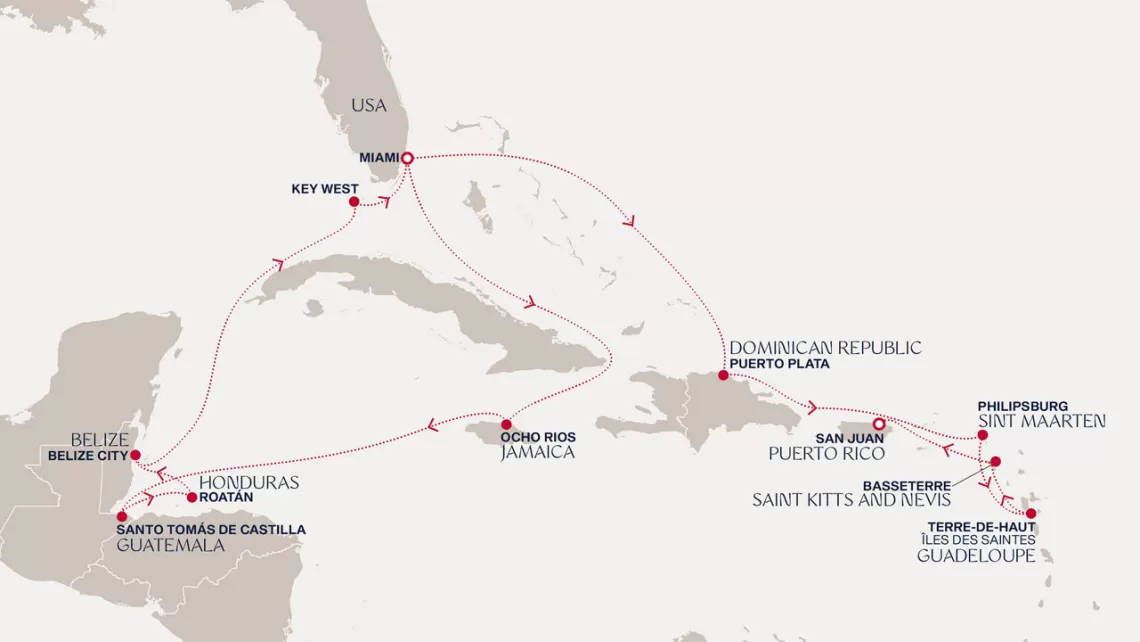 Маршрут круиза: Майами - море - Очо-Риос - море - Картахена - Колон - Лимон - море - о. Роатан - Белиз-Сити - море - Майами - море - море - Шарлотта-Амалия, о. Сент-Томас - Бастер, о. Сент-Китс - Филипсбург, о. Синт-Мартен - Сент-Джонс, о.Антигуа - Сан-Хуан - Пуэрто-Плата - море - Майами